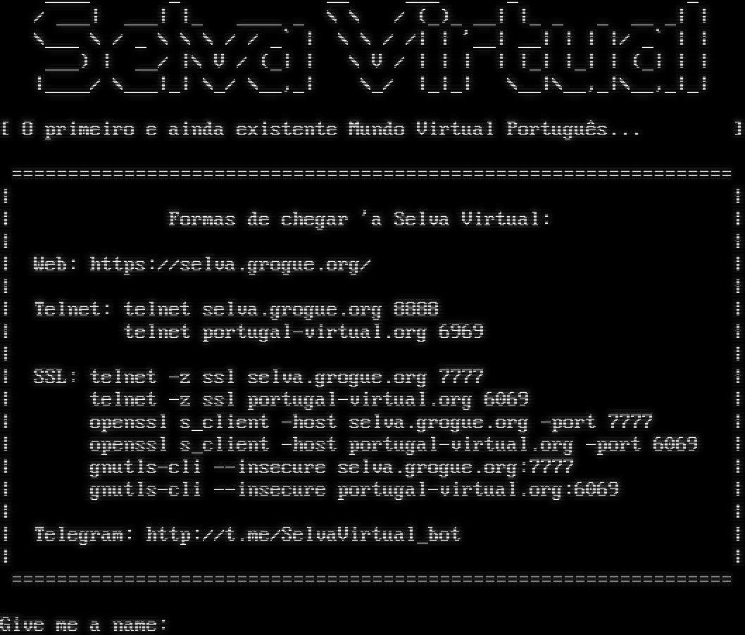 _​___ _ __ ___ _ _ / ___\| ___\| \|_ _​___ _ \\ \\ / (_)_ __\| \|_ _ _ __ _\| \| \\___ \\ / _ \\ \\ \\ / / _\` \| \\ \\ / /\| \| '__\| __\| \| \| \|/ _\` \| \| ___) \| __/ \|\\ V / (_\| \| \\ V / \| \| \| \| \|_\| \|_\| \| (_\| \| \| \|_​___/ \\___\|_\| \\_/ \\__,_\| \\_/ \|_\|_\| \\__\|\\__,_\|\\__,_\|_\| [ O primeiro e ainda existente Mundo Virtual Português... ] =​=============================================================== \| \| \| Formas de chegar 'a Selva Virtual: \| \| \| \| Web: https://selva.grogue.org/ \| \| \| \| Telnet: telnet selva.grogue.org 8888 \| \| telnet portugal-virtual.org 6969 \| \| \| \| SSL: telnet -z ssl selva.grogue.org 7777 \| \| telnet -z ssl portugal-virtual.org 6069 \| \| openssl s_client -host selva.grogue.org -port 7777 \| \| openssl s_client -host portugal-virtual.org -port 6069 \| \| gnutls-cli --insecure selva.grogue.org:7777 \| \| gnutls-cli --insecure portugal-virtual.org:6069 \| \| \| \| Telegram: http://t.me/SelvaVirtual_bot \| \| \| =​=============================================================== Give me a name: