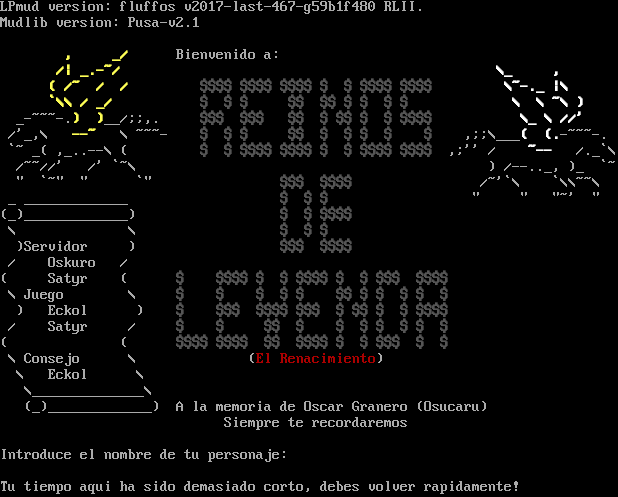 LPmud version: fluffos v2017-last-467-g59b1f480 RLII. Mudlib version: Pusa-v2.1 Si tienes dificultades de vision, ignora los caracteres que se mostraran a continuacion y dinos con que nombre quieres ser conocido. , _/ Bienvenido a: /\| _​.-~/ \\_ , ( /~ / / $$$$ $$$$ $$$$ $ $ $$$$ $$$$ \\~​-._ \|\\ \`\\\\ / _/ $ $ $ $$ $$ $ $ $ $ \\ \\ ~\\ ) _​-~~~-.) )__/;;,. $$$ $$$ $$ $ $$ $ $ $$$$ \\_ \\ //' /'_,\\ --~ \\ ~​~~- $ $ $ $$ $ $ $ $ $ ,;;\\___( (.​-~~~-. \`~ _( ,_​..--\\ ( $ $ $$$$ $$$$ $ $ $$$$ $$$$ ,;'' / ~-- /._\`\\ /~~//' /' \`~\\ ) /-​-.._, )_ \`~ " \`~" " \`" $$$ $$$$ /~'\`\\ \`\\\\~~\\ _ _​____________ $ $ $ " " "~' " (_)_​____________) $ $ $$$$ \\ \\ $ $ $ )Servidor ) $$$ $$$$ / Oskuro / ( Satyr ( $ $$$$ $ $ $$$$ $ $ $$$ $$$$ \\ Juego \\ $ $ $ $ $ $$ $ $ $ $ $ ) Eckol ) $ $$$ $$$$ $$$ $ $$ $ $ $$$$ / Satyr / $ $ $$ $ $ $ $ $ $ $ ( ( $$$$ $$$$ $$ $$$$ $ $ $$$ $ $ \\ Consejo \\ (El Renacimiento) \\ Eckol \\ \\_​_____________\\ (_)_​____________) A la memoria de Oscar Granero (Osucaru) Siempre te recordaremos Introduce el nombre de tu personaje:<VERSION> Tu tiempo aqui ha sido demasiado corto, debes volver rapidamente!