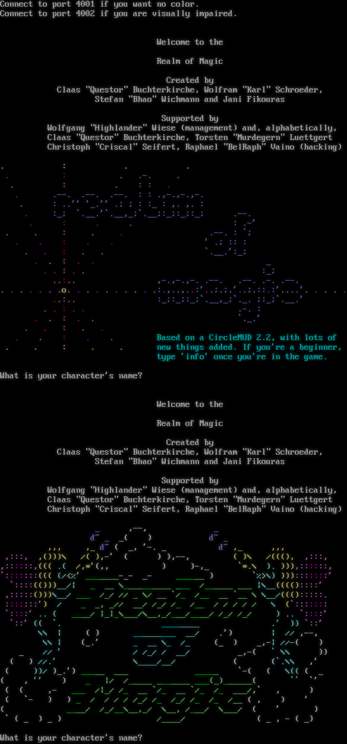 Connect to port 4001 if you want no color. Connect to port 4002 if you are visually impaired. Welcome to the Realm of Magic Created by Claas "Questor" Buchterkirche, Wolfram "Karl" Schroeder, Stefan "Bhao" Wichmann and Jani Fikouras Supported by Wolfgang "Highlander" Wiese (management) and, alphabetically, Claas "Questor" Buchterkirche, Torsten "Murdegern" Luettgert Christoph "Criscal" Seifert, Raphael "BelRaph" Vaino (hacking) . : . . . : . .-. . . : . : : . . .​--. .​--. .​--. : : .,-.,-.,-. . : ..'' '_.'' .; ; : :_ : ,. ,. : . :_; \`.​__.'\`.__,_;\`.__;:_;:_;:_; .​--. . : . . : .-' . . : . . .​--. : \`; . . : . . ' .; :: : . . : . . \`.​__.':_; . . : . . _ . . : . . :_; ..:.. ,-.,-.,-. .​--. .​--. .-. .​--. . . . . . . .o. . . . . . . . . .:.,..,..:'..;.;.'..;.::.:'.​...'. . . . . ..:.. :_;:_;:_;\`.__,_;\`._. ;:_;\`.​__.' . . : . . .-. : . . : . . \`._.' . . : . . . . : . . Based on a CircleMUD 2.2, with lots of . . : . . new things added. If you're a beginner, type 'info' once you're in the game. What is your character's name? Welcome to the Realm of Magic Created by Claas "Questor" Buchterkirche, Wolfram "Karl" Schroeder, Stefan "Bhao" Wichmann and Jani Fikouras Supported by Wolfgang "Highlander" Wiese (management) and, alphabetically, Claas "Questor" Buchterkirche, Torsten "Murdegern" Luettgert Christoph "Criscal" Seifert, Raphael "BelRaph" Vaino (hacking) _ ,--, _ d~ _ _( ) d~ _ ,,, ,_ d~ ( _, '-. _ d~ ,_ ,,, ,:::, ,()))\\ /( ),-' ( ) ),--, ( )\\ /(((), ,:::, ,::::::,((( .( /,\*'(,, ) )-,_ \`\*.\\ ). ))),::::::, \`:::::::((( (/<%' _​______-_- _- _​_____ ) \`%>\\) ))):::::::' \`::::(()))__/\| _ __ \\_​_________ ___ /_​_____ ___ \|\\__(((()::::' ,:::::()))\\__/ ___ /_/ // _ \\/ __ \`/_ /__ __ \`__ \\ \\__/((():::::. :::::::') / _ _, _// __/ /_/ /_ /__ / / / / / \\ (\`::::::: \`::::' .. ( _​___/ \|_\|_\\___/\\__,_/___/_​___/ /_/ /_/ ) .. \`::::' \`::' (( \`. _​_______ .' )) \`::' \\\\ \| ( ) _​________ __/ .') \| // ,--, \\\\ \| (_.' _ __ \\_ /_ (_ ) _,-\| //-( ) _ // ' / /_/ / __/ _,-( \` \\\\ )) ( ) //.' \\_​___/__/ ( (\`.\\\\ ,' ( ))/ )_.') _​____ ___ _​____ \`-( ( \\(( ( _ ( , '' ) _ \|/ /_​____ _​______ ___(_)_​_____( \`\` \`' ( ( ,- ___ /\|_/ /_ __ \`/_ __ \`/_ /_ ___/,\` , ) ( \`- ) ) _ / / / / /_/ /_ /_/ /_ /_ /__ ( , ) ' ( _​___/ /_/__\\__,_/ \\__, /___/ \\___/ ( ' ) \` ( _ ) _ ) /_​___/ ( _ , - ( _) What is your character's name?