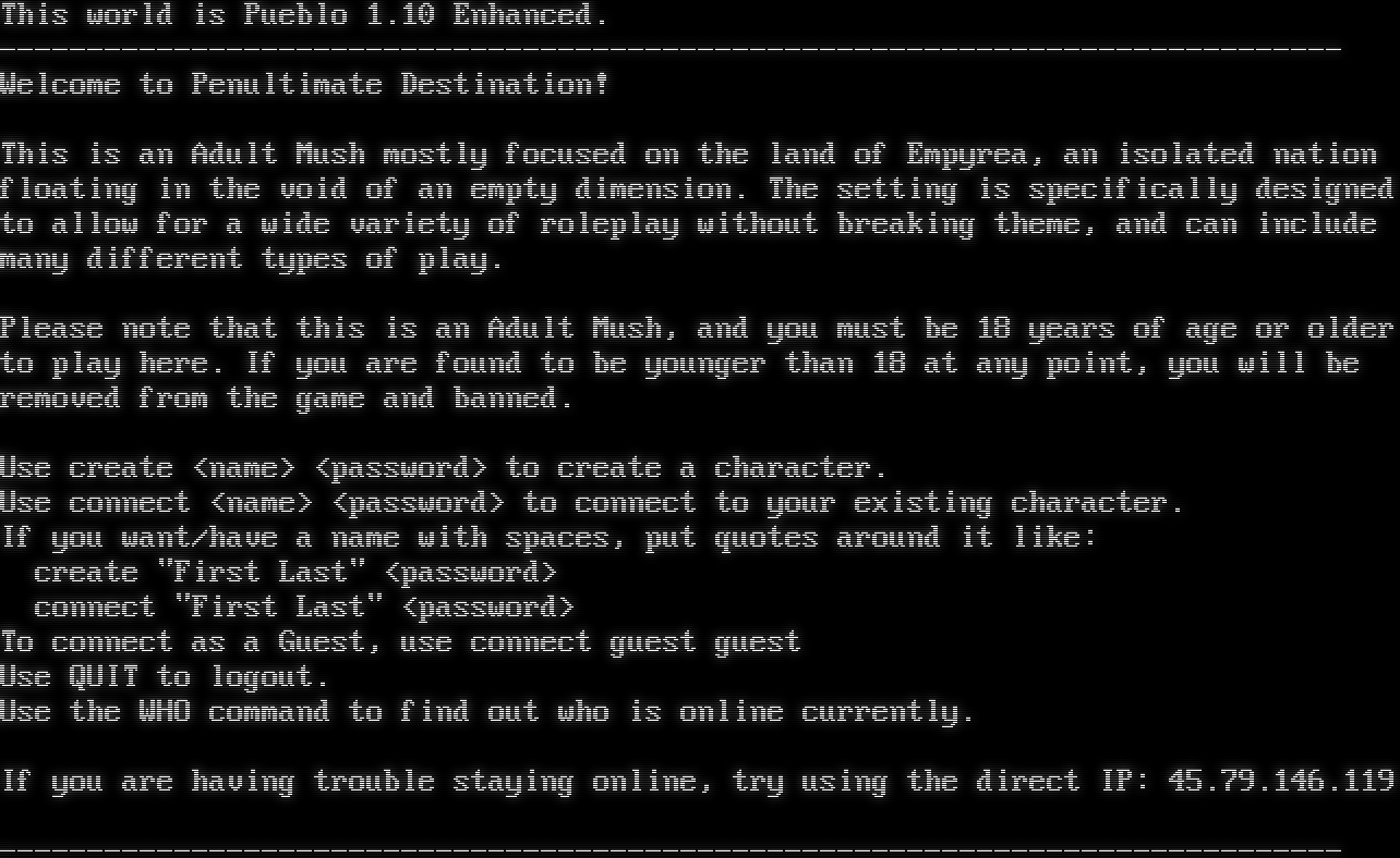 This world is Pueblo 1.10 Enhanced. -​---------------------------------------------------------------------------- Welcome to Penultimate Destination! This is an Adult Mush mostly focused on the land of Empyrea, an isolated nation floating in the void of an empty dimension. The setting is specifically designed to allow for a wide variety of roleplay without breaking theme, and can include many different types of play. Please note that this is an Adult Mush, and you must be 18 years of age or older to play here. If you are found to be younger than 18 at any point, you will be removed from the game and banned. Use create <name> <password> to create a character. Use connect <name> <password> to connect to your existing character. If you want/have a name with spaces, put quotes around it like: create "First Last" <password> connect "First Last" <password> To connect as a Guest, use connect guest guest Use QUIT to logout. Use the WHO command to find out who is online currently. If you are having trouble staying online, try using the direct IP: 45.79.146.119 -​----------------------------------------------------------------------------