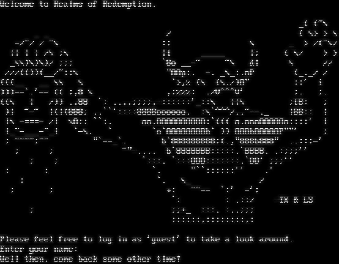 Welcome to Realms of Redemption. _( (~\\ _ _ / ( \\> > \\ -/~/ / ~\\ :; \\ _ > /(~\\/ \|\| \| \| /\\ ;\\ \|l _​____ \|; ( \\/ > > _\\\\)\\)\\)/ ;;; \`8o _​_-~ ~\\ d\| \\ // ///(())(__/~;;\\ "88p;. -. _\\_;.oP (_._/ / (((__ __ \\\\ \\ \`>,% (\\ (\\./)8" ;:' i )))--\`.'-- (( ;,8 \\ ,;%%%: ./V^^^V' ;. ;. ((\\ \| /)) .,88 \`: ..,,;;;;,-::::::'_::\\ \|\|\\ ;[8: ; )\| ~-~ \|(\|(888; ..\`\`'::::8888oooooo. :\\\`^^^/,,~​--._ \|88:: \| \|\\ -​===- /\| \\8;; \`\`:. oo.8888888888:\`((( o.ooo8888Oo;:;:' \| \|_​~-___-~_\| \`-\\. \` \`o\`88888888b\` )) 888b88888P""' ; ; ~​~~~;~~ "\`--_\`. b\`888888888;(.,"888b888" ..::;-' ; ; ~​"-.... b\`8888888:::::.\`8888. .:;;;'' ; ; \`:::. \`:::OOO:::::::.\`OO' ;;;'' : ; \`. "\`\`::::::'' .' ; \`. \\_ / ; ; +: ~​~-- \`:' -'; \`: : .::/ -TX & LS ; ;;+_ :::. :..;;; ;;;;;;,;;;;;;;;,; Please feel free to log in as 'guest' to take a look around. Enter your name: Well then, come back some other time!