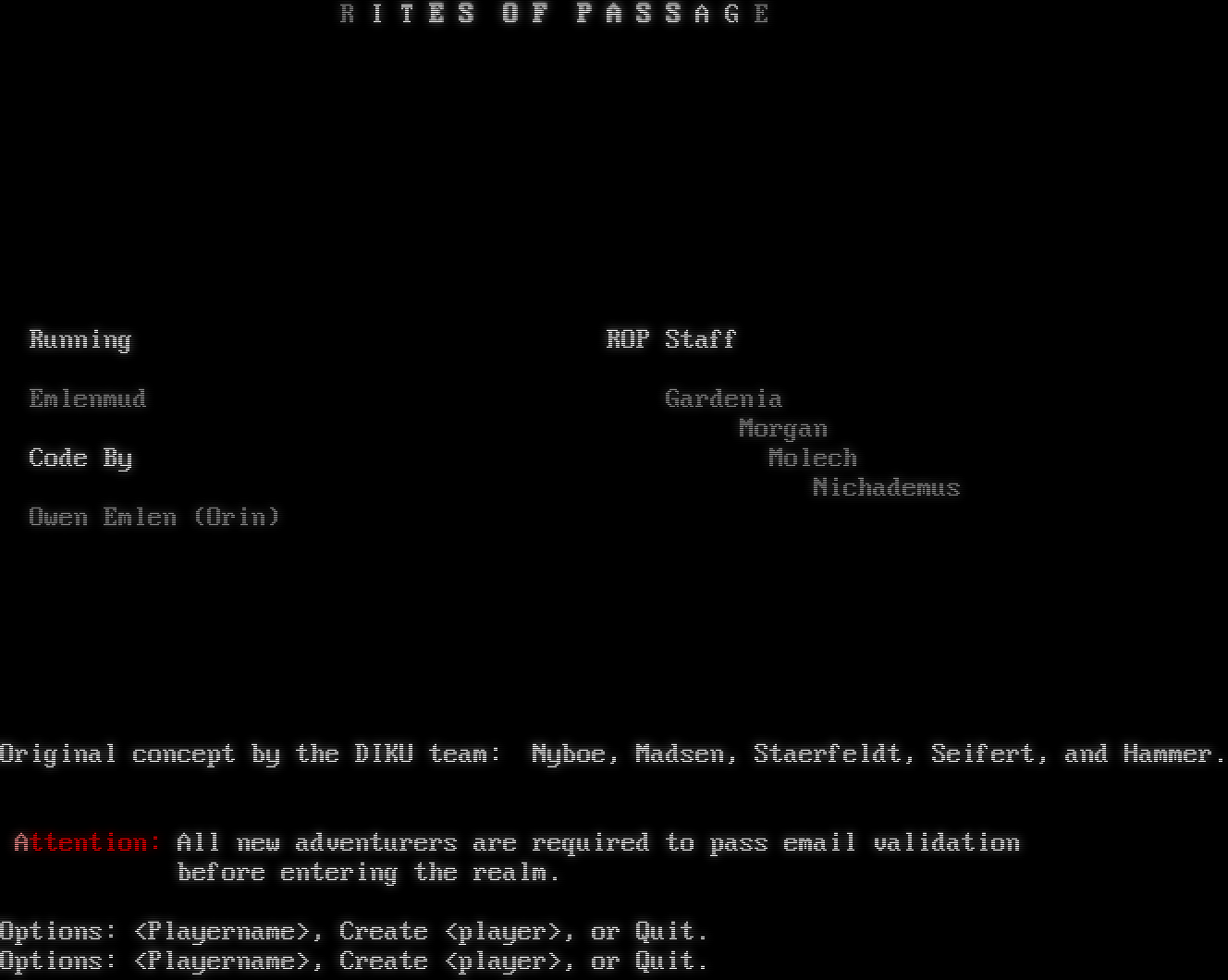 Press Enter to log in... R I T E S O F P A S S A G E ߲ Running ROP Staff Emlenmud Gardenia ߰Morgan Code By Molech Nichademus Owen Emlen (Orin)  Original concept by the DIKU team: Nyboe, Madsen, Staerfeldt, Seifert, and Hammer. Attention: All new adventurers are required to pass email validation before entering the realm. Options: <Playername>, Create <player>, or Quit. Options: <Playername>, Create <player>, or Quit.