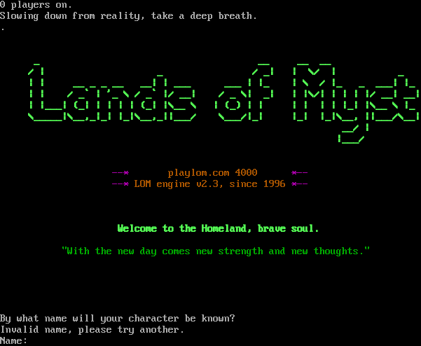 0 players on. Slowing down from reality, take a deep breath. . _ __ __ __ / \| _ / _\| \| \\/ \| _ \| \| __ _ _ __ __\| \| ___ ___ \| \|_ \| \\ / \|_ _ ___\| \|_ \| \| / _\` \| '_ \\ / _\` \|/ __\| / _ \\\| _\| \| \|\\/\| \| \| \| \|/ __\| __\| \| \|___\| (_\| \| \| \| \| (_\| \|\\__ \\ \| (_) \| \| \| \| \| \| \|_\| \|\\__ \\ \|_ \\_​____\|\\__,_\|_\| \|_\|\\__,_\|\|___/ \\___/\|_\| \|_\| \|_\|\\__, \|\|___/\\__\| __/ \| \|___/ --\* playlom.com 4000 \*-- --\* LOM engine v2.3, since 1996 \*-- Welcome to the Homeland, brave soul. "With the new day comes new strength and new thoughts." By what name will your character be known? Invalid name, please try another. Name: