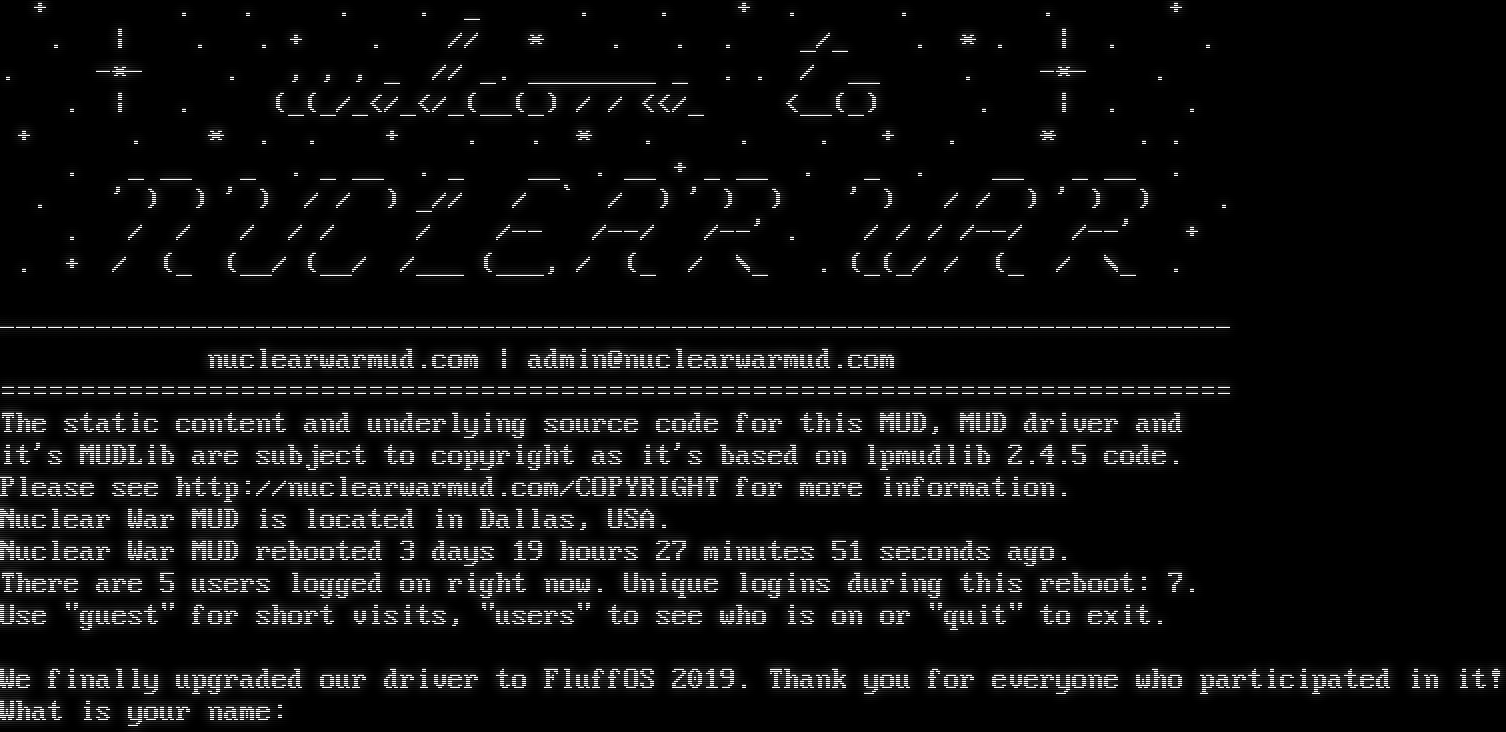 + . . . . _ . . + . . . + . \| . . + . // \* . . . _/_ . \* . \| . . . -\*- . , , , _ // _. _​_______ _ . . / __ . -\*- . . \| . (_(_/_</_</_(__(_) / / <</_ <__(_) . \| . . + . \* . . + . . \* . . . + . \* . . . _ __ _ . _ __ . _ __ . __ + _ __ . _ . __ _ __ . . ' ) ) ' ) / / ) _// / \` / ) ' ) ) ' ) / / ) ' ) ) . . / / / / / / /-- /--/ /--' . / / / /--/ /--' + . + / (_ (__/ (__/ /___ (___, / (_ / \\_ . (_(_/ / (_ / \\_ . -​---------------------------------------------------------------------------- nuclearwarmud.com \| admin@nuclearwarmud.com =​============================================================================ The static content and underlying source code for this MUD, MUD driver and it's MUDLib are subject to copyright as it's based on lpmudlib 2.4.5 code. Please see http://nuclearwarmud.com/COPYRIGHT for more information. Nuclear War MUD is located in Dallas, USA. Nuclear War MUD rebooted 3 days 19 hours 27 minutes 51 seconds ago. There are 5 users logged on right now. Unique logins during this reboot: 7. Use "guest" for short visits, "users" to see who is on or "quit" to exit. We finally upgraded our driver to FluffOS 2019. Thank you for everyone who participated in it! What is your name: