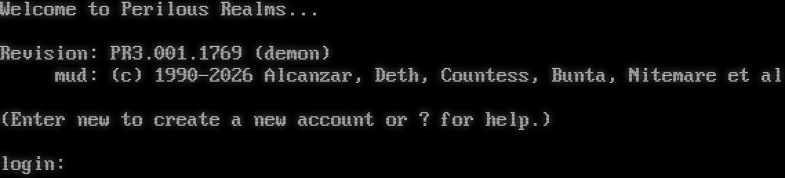 Welcome to Perilous Realms... Revision: PR3.001.1769 (demon) mud: (c) 1990-2026 Alcanzar, Deth, Countess, Bunta, Nitemare et al (Enter new to create a new account or ? for help.) login: