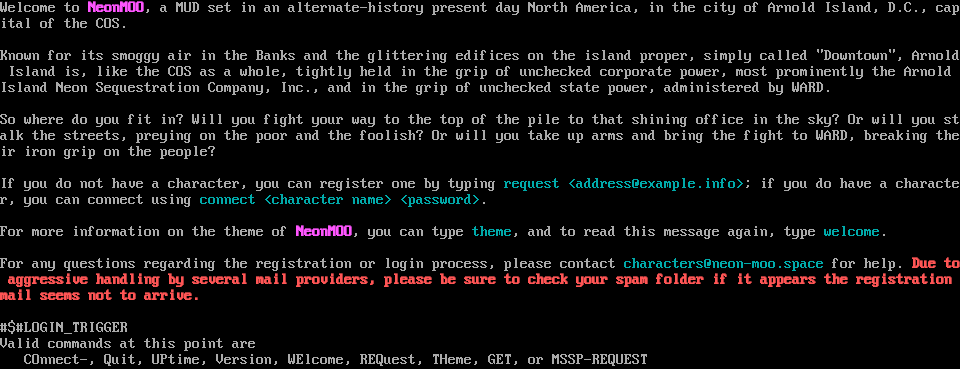 Welcome to NeonMOO, a MUD set in an alternate-history present day North America, in the city of Arnold Island, D.C., capital of the COS. Known for its smoggy air in the Banks and the glittering edifices on the island proper, simply called "Downtown", Arnold Island is, like the COS as a whole, tightly held in the grip of unchecked corporate power, most prominently the Arnold Island Neon Sequestration Company, Inc., and in the grip of unchecked state power, administered by WARD. So where do you fit in? Will you fight your way to the top of the pile to that shining office in the sky? Or will you stalk the streets, preying on the poor and the foolish? Or will you take up arms and bring the fight to WARD, breaking their iron grip on the people? If you do not have a character, you can register one by typing request <address@example.info>; if you do have a character, you can connect using connect <character name> <password>. For more information on the theme of NeonMOO, you can type theme, and to read this message again, type welcome. For any questions regarding the registration or login process, please contact characters@neon-moo.space for help. Due to aggressive handling by several mail providers, please be sure to check your spam folder if it appears the registration mail seems not to arrive. #$#LOGIN_TRIGGER Valid commands at this point are COnnect-, Quit, UPtime, Version, WElcome, REQuest, THeme, GET, or MSSP-REQUEST