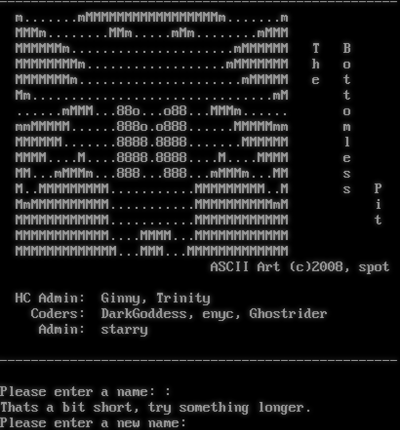 -​-------------------------------------------------- m.​......mMMMMMMMMMMMMMMMMMm.​......m MMMm.​.......MMm.​....mMm.​.......mMMM MMMMMMm.​....................mMMMMMM T B MMMMMMMMm.​.................mMMMMMMM h o MMMMMMMm.​....................mMMMMM e t Mm.​..............................mM t .​.....mMMM...88o...o88...MMMm.​..... o mmMMMMM.​.....888o.o888.​.....MMMMMmm m MMMMMM.​......8888.8888.​......MMMMMM l MMMM.​...M.​...8888.8888.​...M.​...MMMM e MM...mMMMm...888...888...mMMMm...MM s M..MMMMMMMMM.​..........MMMMMMMMM..M s P MmMMMMMMMMMM.​..........MMMMMMMMMMmM i MMMMMMMMMMMM.​..........MMMMMMMMMMMM t MMMMMMMMMMMM.​...MMMM...MMMMMMMMMMMM MMMMMMMMMMMMM...MMM...MMMMMMMMMMMMM ASCII Art (c)2008, spot HC Admin: Ginny, Trinity Coders: DarkGoddess, enyc, Ghostrider Admin: starry -​-------------------------------------------------- Please enter a name: : Thats a bit short, try something longer. Please enter a new name: