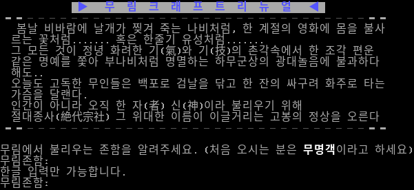 ▶ 무 림 크 래 프 트 리 뉴 얼 ◀ ━━───────────────────────────────━━ 봄날 비바람에 날개가 찢겨 죽는 나비처럼, 한 계절의 영화에 몸을 불사 르는 꽃처럼.​...... 혹은 한줄기 유성처럼.​...... 그 모든 것이 정녕 화려한 기(氣)와 기(技)의 촌각속에서 한 조각 편운 같은 명예를 쫓아 부나비처럼 명멸하는 하무군상의 광대놀음에 불과하다 해도.. 오늘도 고독한 무인들은 백포로 검날을 닦고 한 잔의 싸구려 화주로 타는 가슴을 달랜다. 인간이 아니라 오직 한 자(者) 신(神)이라 불리우기 위해 절대종사(絶代宗社) 그 위대한 이름이 이글거리는 고봉의 정상을 오른다 ━━───────────────────────────────━━ 무림에서 불리우는 존함을 알려주세요. (처음 오시는 분은 무명객이라고 하세요) 무림존함ː 한글 입력만 가능합니다. 무림존함ː