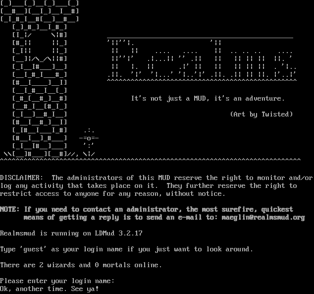 [_]___[_]__[_]___[_] [_​_#__][__I_]__I__#] [_I_#_I__#[__]_​_#__] [_]_#_]__I_#_] [I_\|/ \\\|#] _​______________________________________________ [#_\|\| \|\|_] '\|\|''\|. '\|\| [_I\|\| \|\|_] \|\| \|\| .​... .​... \|\| .. .. .. .​... [__]\|/\\_/\\\|\|#] \|\|''\|' .\|...\|\| '' .\|\| \|\| \|\| \|\| \|\| \|\|. ' [_I__I#​___]__] \|\| \|. \|\| .\|' \|\| \|\| \|\| \|\| \|\| . '\|.. [__I_#_I_​__#_] .\|\|. '\|' '\|...' '\|..'\|' .\|\|. .\|\| \|\| \|\|. \|'..\|' [#__I_​___]__I] ^​^^^^^^^^^^^^^^^^^^^^^^^^^^^^^^^^^^^^^^^^^^^^^^^ [__I_​#__I__[_] [_#_[_​_#_]__#] It's not just a MUD, it's an adventure. [_​_#_I__[#_I_] [_I__]_​_#_I__] (Art by Twisted) [#__I_​_#_]__I] [_I#__I___I_#] .:. [#__I__]_​#___] -=o=- [_I__I#__]___] ':' \\\\[__]#​___][__#]//, \\\|/ ^​^^^^^^^^^^^^^^^^^^^^^^^^^^^^^^^^^^^^^^^^^^^^^^^^^^^^^^^^^^^^^^^^^^^^^^^^^^^ DISCLAIMER: The administrators of this MUD reserve the right to monitor and/or log any activity that takes place on it. They further reserve the right to restrict access to anyone for any reason, without notice. NOTE: If you need to contact an administrator, the most surefire, quickest means of getting a reply is to send an e-mail to: maeglin@realmsmud.org Realmsmud is running on LDMud 3.2.17 Type 'guest' as your login name if you just want to look around. There are 2 wizards and 0 mortals online. Please enter your login name: Ok, another time. See ya!