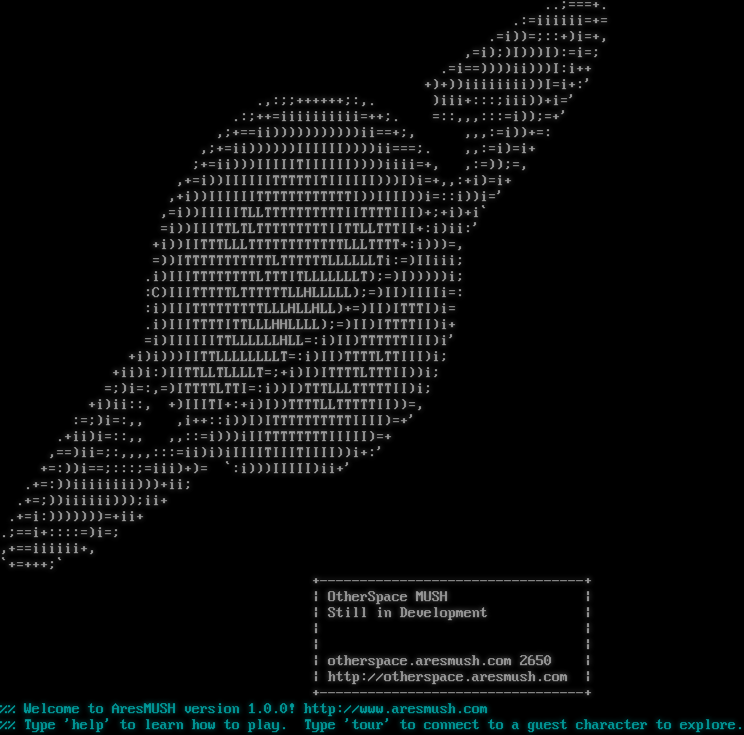 ..;=​==+. .:=iiiiii=+= .=i))=;::+)i=+, ,=i);)I)))I):=i=; .=i==))))ii)))I:i++ +)+))iiiiiiii))I=i+:' .,:;;+​+++++;:,. )iii+:::;iii))+i=' .:;++=iiiiiiiiii=++;. =::,,,:::=i));=+' ,;+==ii)))))))))))ii==+;, ,,,:=i))+=: ,;+=ii))))))IIIIII))))ii===;. ,,:=i)=i+ ;+=ii)))IIIIITIIIIII))))iiii=+, ,:=));=, ,+=i))IIIIIITTTTTITIIIIII)))I)i=+,,:+i)=i+ ,+i))IIIIIITTTTTTTTTTTTI))IIII))i=::i))i=' ,=i))IIIIITLLTTTTTTTTTTIITTTTIII)+;+i)+i\` =i))IIITTLTLTTTTTTTTTIITTLLTTTII+:i)ii:' +i))IITTTLLLTTTTTTTTTTTTLLLTTTT+:i)))=, =))ITTTTTTTTTTTLTTTTTTLLLLLLTi:=)IIiii; .i)IIITTTTTTTTLTTTITLLLLLLLT);=)I)))))i; :C)IIITTTTTLTTTTTTLLHLLLLL);=)II)IIIIi=: :i)IIITTTTTTTTTLLLHLLHLL)+=)II)ITTTI)i= .i)IIITTTTITTLLLHHLLLL);=)II)ITTTTII)i+ =i)IIIIIITTLLLLLLHLL=:i)II)TTTTTTIII)i' +i)i)))IITTLLLLLLLLT=:i)II)TTTTLTTIII)i; +ii)i:)IITTLLTLLLLT=;+i)I)ITTTTLTTTII))i; =;)i=:,=)ITTTTLTTI=:i))I)TTTLLLTTTTTII)i; +i)ii::, +)IIITI+:+i)I))TTTTLLTTTTTII))=, :=;)i=:,, ,i++::i))I)ITTTTTTTTTTIIII)=+' .+ii)i=::,, ,,::=i)))iIITTTTTTTTIIIII)=+ ,==)ii=;:,,,,:::=ii)i)iIIIITIIITIIII))i+:' +=:))i==;:::;=iii)+)= \`:i)))IIIII)ii+' .+=:))iiiiiiii)))+ii; .+=;))iiiiii)));ii+ .+=i:)))))))=+ii+ .;==i+::::=)i=; ,+==iiiiii+, \`+​=+++;\` +​---------------------------------+ \| OtherSpace MUSH \| \| Still in Development \| \| \| \| \| \| otherspace.aresmush.com 2650 \| \| http://otherspace.aresmush.com \| +​---------------------------------+ %% Welcome to AresMUSH version 1.0.0! http://www.aresmush.com %% Type 'help' to learn how to play. Type 'tour' to connect to a guest character to explore.