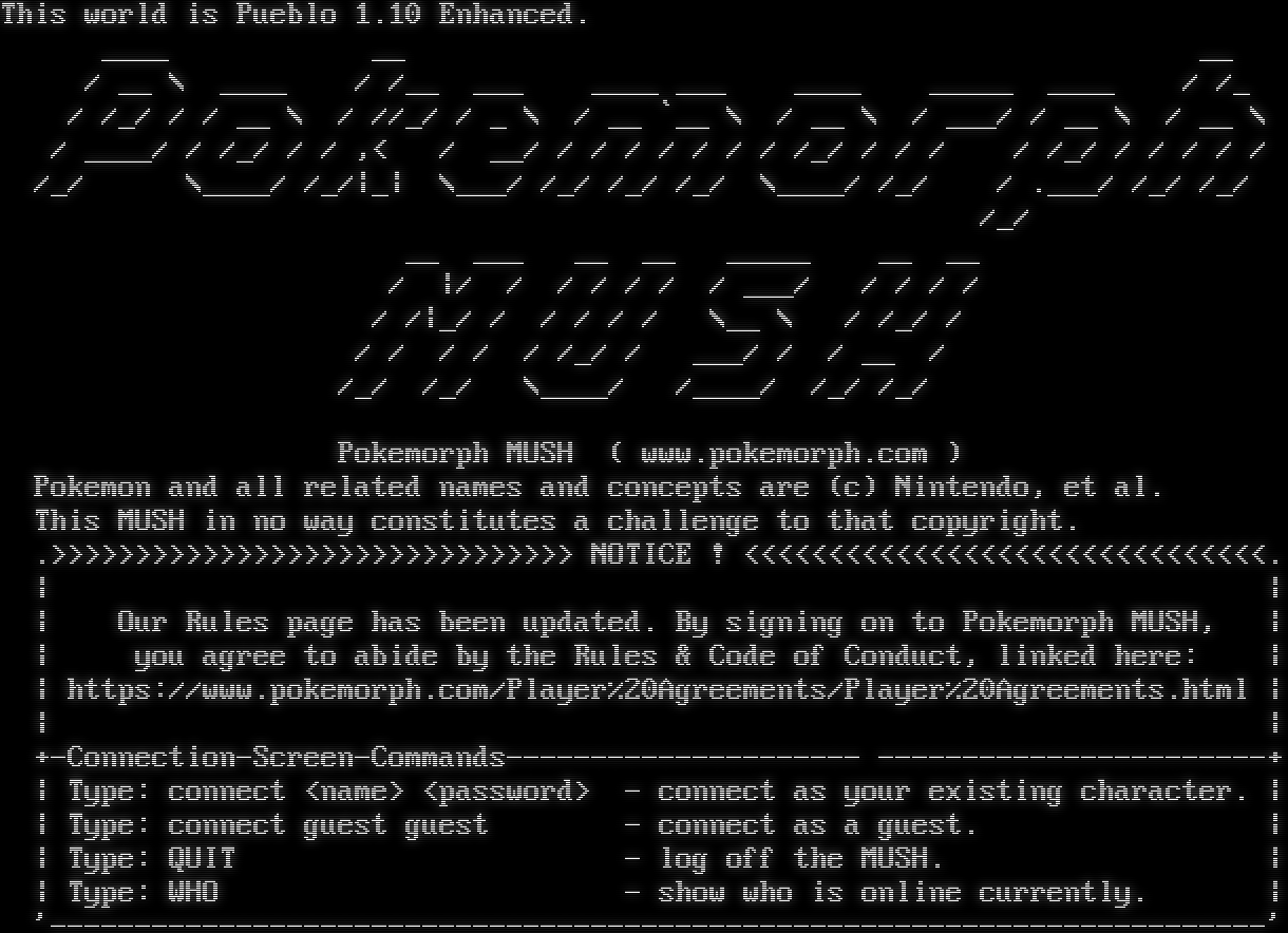 This world is Pueblo 1.10 Enhanced. _​___ __ __ / __ \\ _​___ / /__ ___ _​___ ___ _​___ _​____ _​___ / /_ / /_/ / / __ \\ / //_/ / _ \\ / __ \`__ \\ / __ \\ / ___/ / __ \\ / __ \\ / _​___/ / /_/ / / ,< / __/ / / / / / / / /_/ / / / / /_/ / / / / / /_/ \\_​___/ /_/\|_\| \\___/ /_/ /_/ /_/ \\_​___/ /_/ / .​___/ /_/ /_/ /_/ __ ___ __ __ _​____ __ __ / \|/ / / / / / / ___/ / / / / / /\|_/ / / / / / \\__ \\ / /_/ / / / / / / /_/ / ___/ / / __ / /_/ /_/ \\_​___/ /_​___/ /_/ /_/ Pokemorph MUSH ( www.pokemorph.com ) Pokemon and all related names and concepts are (c) Nintendo, et al. This MUSH in no way constitutes a challenge to that copyright. .>>>>>>>>>>>>>>>>>>>>>>>>>>>>>>> NOTICE ! <<<<<<<<<<<<<<<<<<<<<<<<<<<<<<<. \| \| \| Our Rules page has been updated. By signing on to Pokemorph MUSH, \| \| you agree to abide by the Rules & Code of Conduct, linked here: \| \| https://www.pokemorph.com/Player%20Agreements/Player%20Agreements.html \| \| \| +-Connection-Screen-Commands-​-------------------- -​----------------------+ \| Type: connect <name> <password> - connect as your existing character. \| \| Type: connect guest guest - connect as a guest. \| \| Type: QUIT - log off the MUSH. \| \| Type: WHO - show who is online currently. \| '-​-----------------------------------------------------------------------'