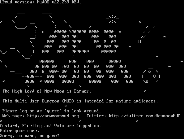 LPmud version: MudOS v22.2b9 DEV. _​__-------____ -- / \\ -- _\\\|/_ / \\ __ \\ \\ /\|\\ \* \\___/ \\ \| \\ \* / / \| o @@@@@ \\@@@@@@ @@@@ @@@@ \* / / __\| @@@ @@@ @@\| @@@ @@@ // \* \\ @@@ @@@ @@@@ @@ @ @@ O __ \\ @@@ @@@ @@\| @@ @@@ @@ \* \\_/ \\ \| @@@ @@@ @@@@@@@ @@@@@@ \\__/ / \* \\ @@@@@@ @@@ @@@ @@@@@ \* \\ @@ @@@ @@ /@@ @@ @@ @@ @@@ @@@ __ \* -​-___ @@@ @__@@@- @@ @@ @@ @@ @@@ @@@ / o \\ --@@@--- @@@ @@@ @@@ @@@ @@@ @@@ @@@ \| O \| \* @@@@ \* @@@@ @@@@@ @@@@@ @@@ @@@ \\o__ / \* \* The High Lord of New Moon is Bannor. \* \* This Multi-User Dungeon (MUD) is intended for mature audiences. \* Please log on as 'guest' to look around. Web page: http://newmoonmud.org Twitter: http://twitter.com/NewmoonMUD \* \* \* Custard, Fleeting and Volo are logged on. Enter your name: Sorry, no name, no game!
