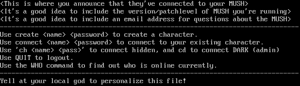 <This is where you announce that they've connected to your MUSH> <It's a good idea to include the version/patchlevel of MUSH you're running> <It's a good idea to include an email address for questions about the MUSH> -​---------------------------------------------------------------------------- Use create <name> <password> to create a character. Use connect <name> <password> to connect to your existing character. Use 'ch <name> <pass>' to connect hidden, and cd to connect DARK (admin) Use QUIT to logout. Use the WHO command to find out who is online currently. -​---------------------------------------------------------------------------- Yell at your local god to personalize this file!