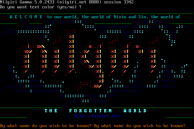 Nilgiri Gamma 5.0.2433 (nilgiri.net 8888) session 3342 Do you want text color (yes/no) ? _​_____________________________________________________________________________ W E L C O M E to our world, the world of Rivin and Sin, the world of _​______ \`:. _​____ .::::::::::::::::. _​______________ .::::::::::::. _​________ , .::::::::::' \`:::::::::::::::::::::::::::::::::::. .::::. .:::::::::::::::::; \`:::' \`::::::::::::::::::; \`:::::: \` ' ::: , :%\| ::; , \`::; , \`::: , \` ,;:' :%\| , ,;:' , ,;:' \`:; .:\|.::%%\\ ... :%\| .::%:.:\|' ... .:\|'.:%:. ... ' :%%/ :%\\ :%\| :%\| .:%/ :%\| :%\| :%\|' %\| :%\| :%\| :%\| :%\| :%\| :%\| :%\| :%\| :%\| ' :%\| :%\| :%\| :%\| :%\| \`:%\\..:%\| :%\| :%\| . :%\| \`: \`::. :%\| :%\| :%/ :%\| \`::%/:%\| :%/ :%/ .: :%/ :::::' .:' :::. :/ :/ :/ ;/\`. :%\|. :/ :/ ::: :/ .:::::. ::; ::::. .:::. ' ' \`:%\| ' ' :::: ' .:::::::::; ' \`:::::::::::. , ,.​... :%\| \`::. :::::. .:::::::: ..::::::::::::::::::::: :;'''::%%/ .:::::::::::::::::::::::::; ' \`::::::::::::::::::. ' .::::::::::::; :::::::::::::::::::::;' .::::::::::::::. _​________________________ ,: _​____________ \` _​________________________________ T H E F O R G O T T E N W O R L D _​__________ http://nilgiri.net/ _​__________ By what name do you wish to be known? By what name do you wish to be known?