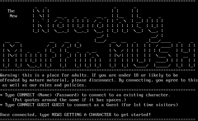 =​============================================================================== _ _ _ _ The \| \\ \| \| \| \| \| \| New \| \\\| \| __ _ _ _ __ _ \| \|__ \| \|_ _ _ \| . \` \| / _\` \| \| \| \| \| / _\` \| \| '_ \\ \| __\| \| \| \| \| \| \|\\ \| \| (_\| \| \| \|_\| \| \| (_\| \| \| \| \| \| \| \|_ \| \|_\| \| \|_\| \\_\| \\__,_\| \\__,_\| \\__, \| \|_\| \|_\| \\__\| \\__, \| __/ \| __/ \| __ __ __ __ _ \|___/ __ __ _ _\|___/_​___ _ _ \| \\/ \| / _\| / _\| (_) \| \\/ \| \| \| \| \| / _​___\| \| \| \| \| \| \\ / \| _ _ \| \|_ \| \|_ _ _ __ \| \\ / \| \| \| \| \| \| (___ \| \|__\| \| \| \|\\/\| \| \| \| \| \| \| _\| \| _\| \| \| \| '_ \\ \| \|\\/\| \| \| \| \| \| \\___ \\ \| __ \| \| \| \| \| \| \|_\| \| \| \| \| \| \| \| \| \| \| \| \| \| \| \| \| \|__\| \| _​___) \| \| \| \| \| \|_\| \|_\| \\__,_\| \|_\| \|_\| \|_\| \|_\| \|_\| \|_\| \|_\| \\_​___/ \|_​____/ \|_\| \|_\| =​============================================================================== Warning: this is a place for adults. If you are under 18 or likely to be offended by mature material, please disconnect. By connecting, you agree to this as well as our rules and policies. =​============================================================================== \* Type CONNECT <Name> <Password> to connect to an existing character. (Put quotes around the name if it has spaces.) \* Type CONNECT GUEST GUEST to connect as a Guest (for 1st time visitors) Once connected, type NEWS GETTING A CHARACTER to get started! =​==============================================================================
