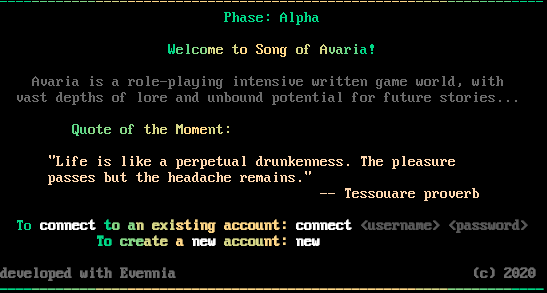 -​------------------------------------------------------------------- Phase: Alpha Welcome to Song of Avaria! Avaria is a role-playing intensive written game world, with vast depths of lore and unbound potential for future stories... Quote of the Moment: "Life is like a perpetual drunkenness. The pleasure passes but the headache remains." -- Tessouare proverb To connect to an existing account: connect &lt;username&gt; &lt;password&gt; To create a new account: new developed with Evennia (c) 2020 -​-------------------------------------------------------------------