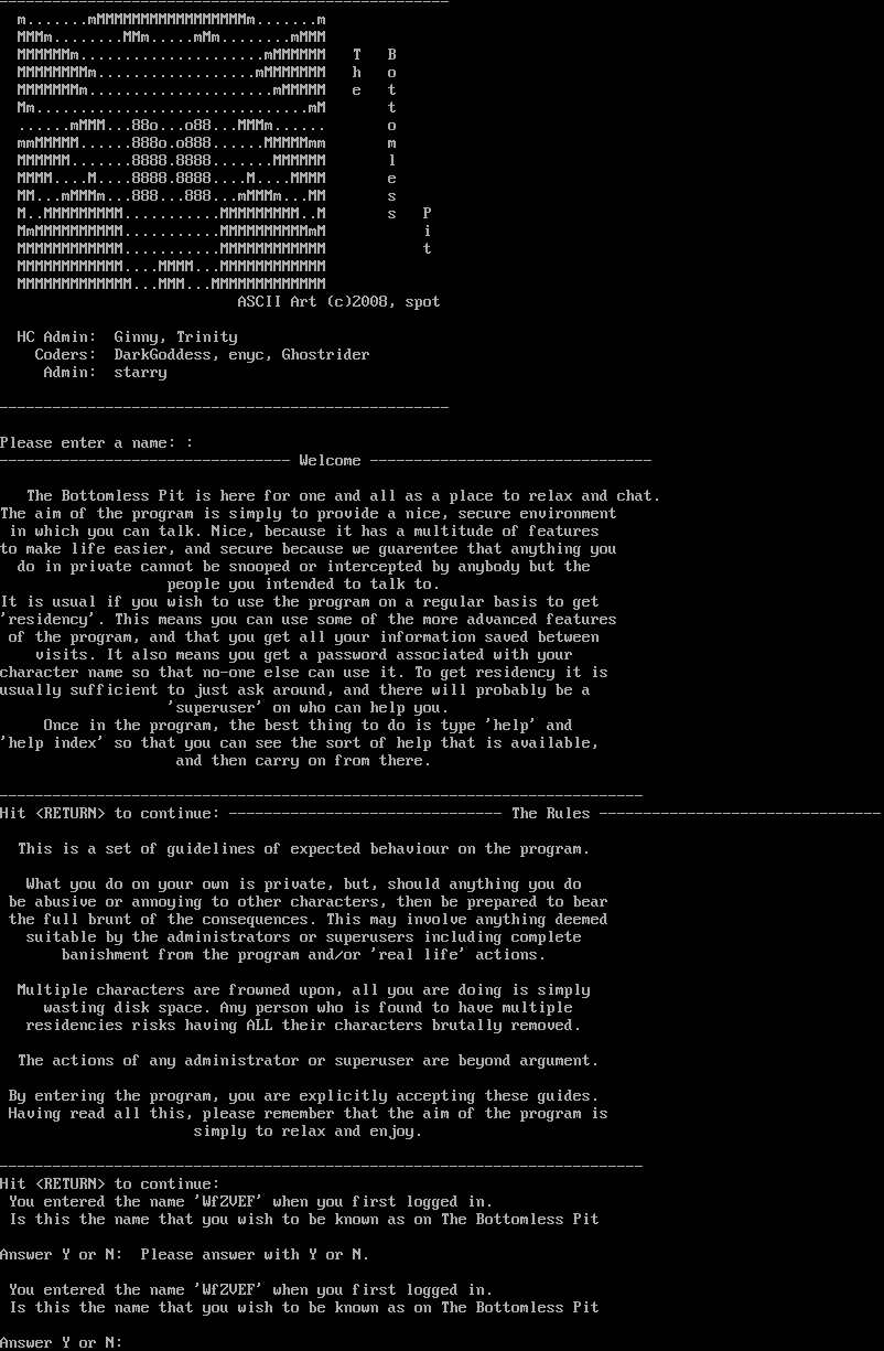 -​-------------------------------------------------- m.​......mMMMMMMMMMMMMMMMMMm.​......m MMMm.​.......MMm.​....mMm.​.......mMMM MMMMMMm.​....................mMMMMMM T B MMMMMMMMm.​.................mMMMMMMM h o MMMMMMMm.​....................mMMMMM e t Mm.​..............................mM t .​.....mMMM...88o...o88...MMMm.​..... o mmMMMMM.​.....888o.o888.​.....MMMMMmm m MMMMMM.​......8888.8888.​......MMMMMM l MMMM.​...M.​...8888.8888.​...M.​...MMMM e MM...mMMMm...888...888...mMMMm...MM s M..MMMMMMMMM.​..........MMMMMMMMM..M s P MmMMMMMMMMMM.​..........MMMMMMMMMMmM i MMMMMMMMMMMM.​..........MMMMMMMMMMMM t MMMMMMMMMMMM.​...MMMM...MMMMMMMMMMMM MMMMMMMMMMMMM...MMM...MMMMMMMMMMMMM ASCII Art (c)2008, spot HC Admin: Ginny, Trinity Coders: DarkGoddess, enyc, Ghostrider Admin: starry -​-------------------------------------------------- Please enter a name: : -​-------------------------------- Welcome -​------------------------------- The Bottomless Pit is here for one and all as a place to relax and chat. The aim of the program is simply to provide a nice, secure environment in which you can talk. Nice, because it has a multitude of features to make life easier, and secure because we guarentee that anything you do in private cannot be snooped or intercepted by anybody but the people you intended to talk to. It is usual if you wish to use the program on a regular basis to get 'residency'. This means you can use some of the more advanced features of the program, and that you get all your information saved between visits. It also means you get a password associated with your character name so that no-one else can use it. To get residency it is usually sufficient to just ask around, and there will probably be a 'superuser' on who can help you. Once in the program, the best thing to do is type 'help' and 'help index' so that you can see the sort of help that is available, and then carry on from there. -​------------------------------------------------------------------------ Hit <RETURN> to continue: -​------------------------------ The Rules -​------------------------------- This is a set of guidelines of expected behaviour on the program. What you do on your own is private, but, should anything you do be abusive or annoying to other characters, then be prepared to bear the full brunt of the consequences. This may involve anything deemed suitable by the administrators or superusers including complete banishment from the program and/or 'real life' actions. Multiple characters are frowned upon, all you are doing is simply wasting disk space. Any person who is found to have multiple residencies risks having ALL their characters brutally removed. The actions of any administrator or superuser are beyond argument. By entering the program, you are explicitly accepting these guides. Having read all this, please remember that the aim of the program is simply to relax and enjoy. -​------------------------------------------------------------------------ Hit <RETURN> to continue: You entered the name 'WfZVEF' when you first logged in. Is this the name that you wish to be known as on The Bottomless Pit Answer Y or N: Please answer with Y or N. You entered the name 'WfZVEF' when you first logged in. Is this the name that you wish to be known as on The Bottomless Pit Answer Y or N: