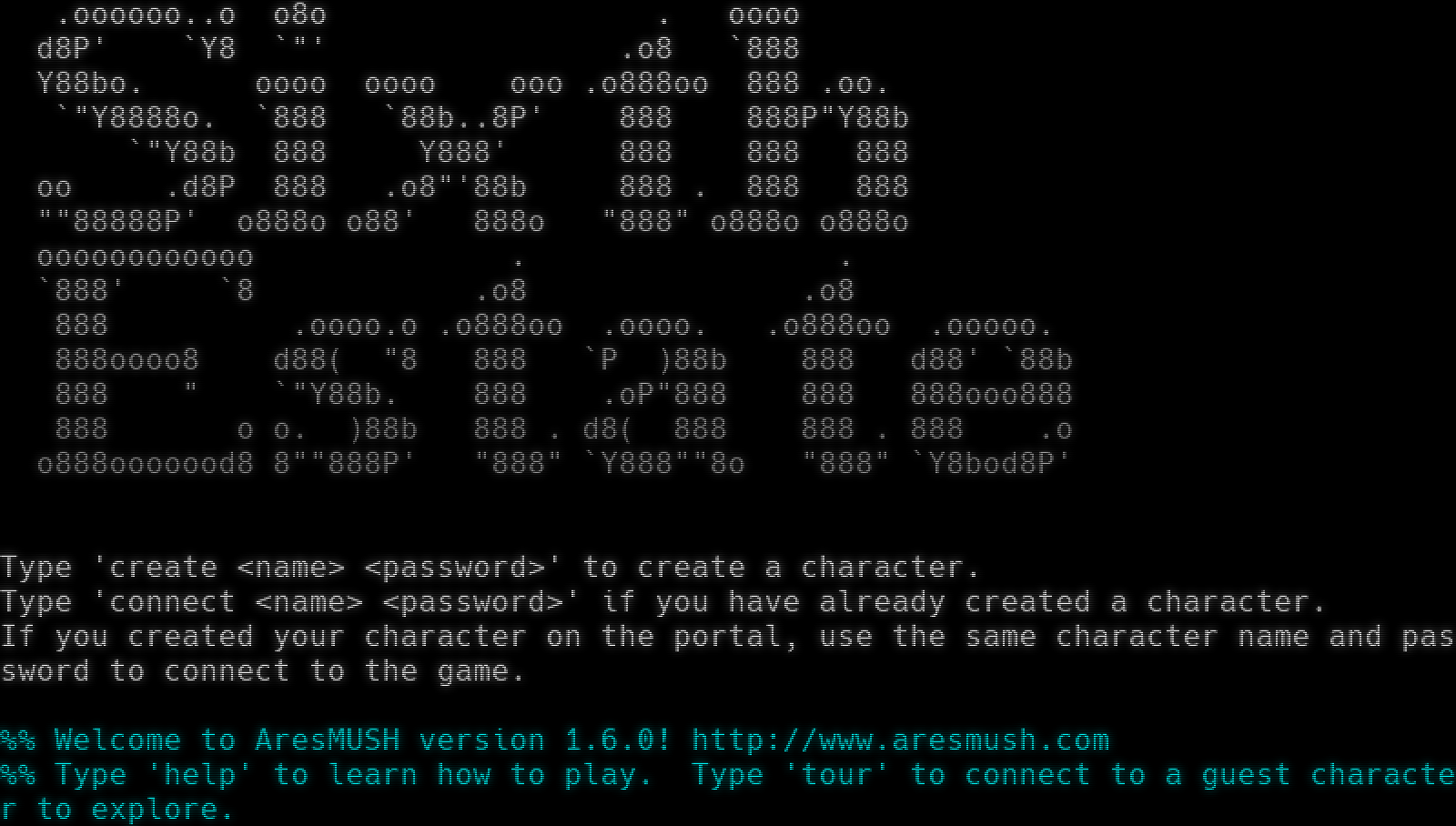 ooooooooooooo oooo 8' 888 \`8 \`888 888 888 .oo. .ooooo. 888 888P"Y88b d88' \`88b 888 888 888 888ooo888 888 888 888 888 .o o888o o888o o888o \`Y8bod8P' .oooooo..o o8o . oooo d8P' \`Y8 \`"' .o8 \`888 Y88bo. oooo oooo ooo .o888oo 888 .oo. \`"Y8888o. \`888 \`88b..8P' 888 888P"Y88b \`"Y88b 888 Y888' 888 888 888 oo .d8P 888 .o8"'88b 888 . 888 888 ""88888P' o888o o88' 888o "888" o888o o888o oooooooooooo . . \`888' \`8 .o8 .o8 888 .oooo.o .o888oo .oooo. .o888oo .ooooo. 888oooo8 d88( "8 888 \`P )88b 888 d88' \`88b 888 " \`"Y88b. 888 .oP"888 888 888ooo888 888 o o. )88b 888 . d8( 888 888 . 888 .o o888ooooood8 8""888P' "888" \`Y888""8o "888" \`Y8bod8P' Type 'create <name> <password>' to create a character. Type 'connect <name> <password>' if you have already created a character. If you created your character on the portal, use the same character name and password to connect to the game. %% Welcome to AresMUSH version 1.6.0! http://www.aresmush.com %% Type 'help' to learn how to play. Type 'tour' to connect to a guest character to explore.