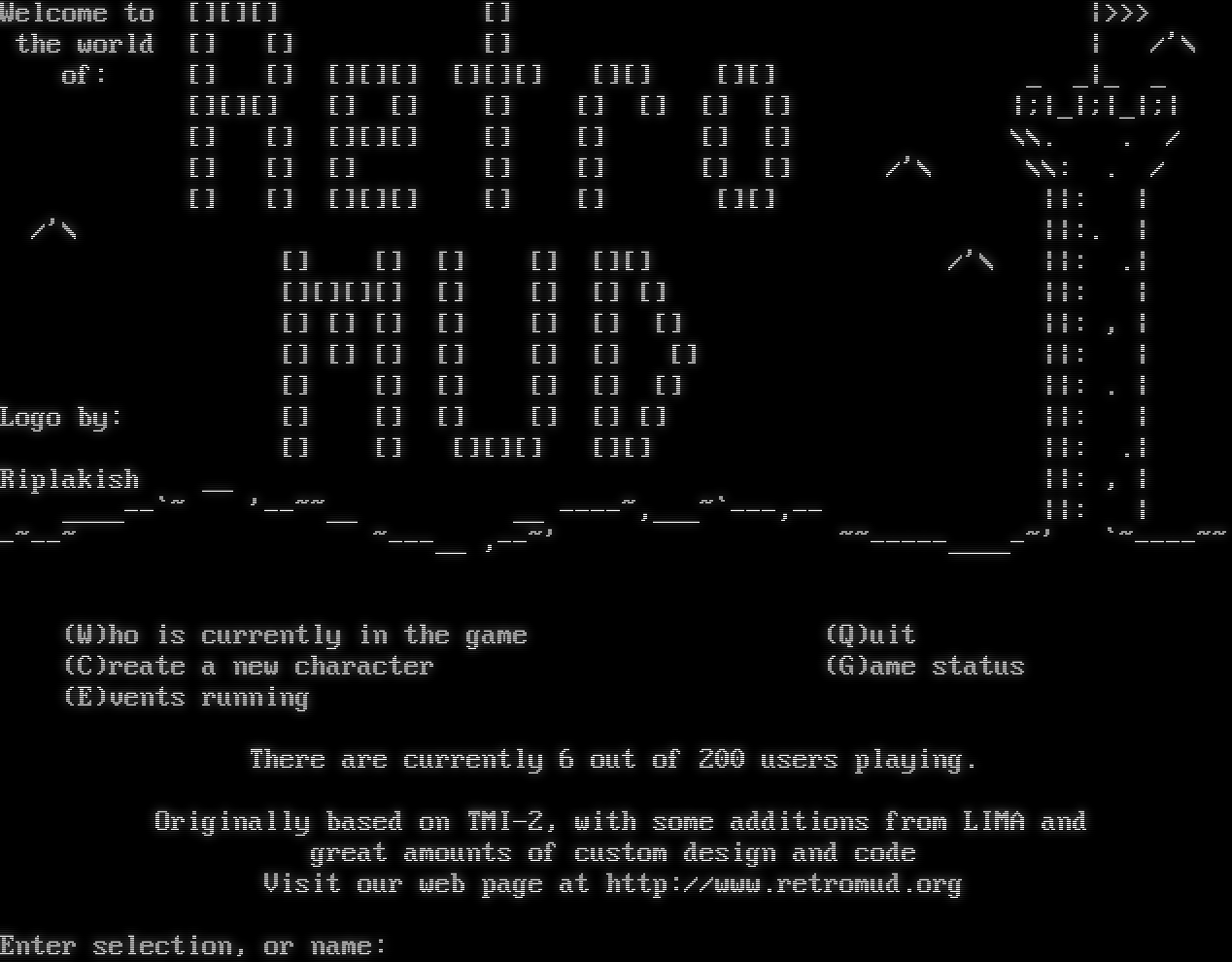 Welcome to [][][] [] \|>>> the world [] [] [] \| /'\\ of: [] [] [][][] [][][] [][] [][] _ _\|_ _ [][][] [] [] [] [] [] [] [] \|;\|_\|;\|_\|;\| [] [] [][][] [] [] [] [] \\\\. . / [] [] [] [] [] [] [] /'\\ \\\\: . / [] [] [][][] [] [] [][] \|\|: \| /'\\ \|\|:. \| [] [] [] [] [][] /'\\ \|\|: .\| [][][][] [] [] [] [] \|\|: \| [] [] [] [] [] [] [] \|\|: , \| [] [] [] [] [] [] [] \|\|: \| [] [] [] [] [] [] \|\|: . \| Logo by: [] [] [] [] [] [] \|\|: \| [] [] [][][] [][] \|\|: .\| Riplakish __ \|\|: , \| _​___--\`~ '-​-~~__ __ -​---~,_​__~\`---,-- \|\|: \| -​~--~ ~​---__ ,--~' ~​~-----____-~' \`~​----~~ (W)ho is currently in the game (Q)uit (C)reate a new character (G)ame status (E)vents running There are currently 6 out of 200 users playing. Originally based on TMI-2, with some additions from LIMA and great amounts of custom design and code Visit our web page at http://www.retromud.org Enter selection, or name: