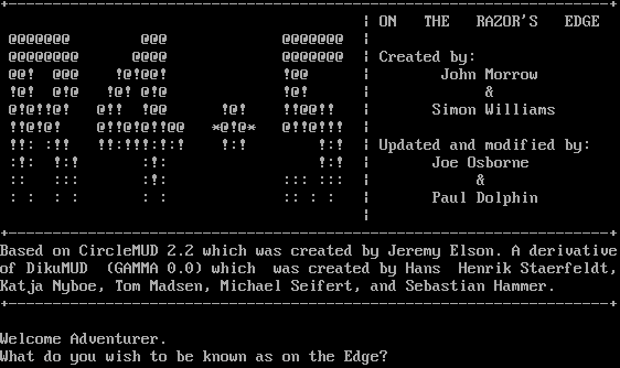 +​--------------------------------------------------------------------+ \| ON THE RAZOR'S EDGE @@@@@@@ @@@ @@@@@@@ \| @@@@@@@@ @@@@ @@@@@@@ \| Created by: @@! @@@ !@!@@! !@@ \| John Morrow !@! @!@ !@! @!@ !@! \| & @!@!!@! @!! !@@ !@! !!@@!! \| Simon Williams !!@!@! @!!@!@!!@@ \*@!@\* @!!@!!! \| !!: :!! !!:!!!:!:! !:! !:! \| Updated and modified by: :!: !:! :!: !:! \| Joe Osborne :: ::: :!: ::: ::: \| & : : : : : : :: : : \| Paul Dolphin \| +​--------------------------------------------------------------------+ Based on CircleMUD 2.2 which was created by Jeremy Elson. A derivative of DikuMUD (GAMMA 0.0) which was created by Hans Henrik Staerfeldt, Katja Nyboe, Tom Madsen, Michael Seifert, and Sebastian Hammer. +​--------------------------------------------------------------------+ Welcome Adventurer. What do you wish to be known as on the Edge?