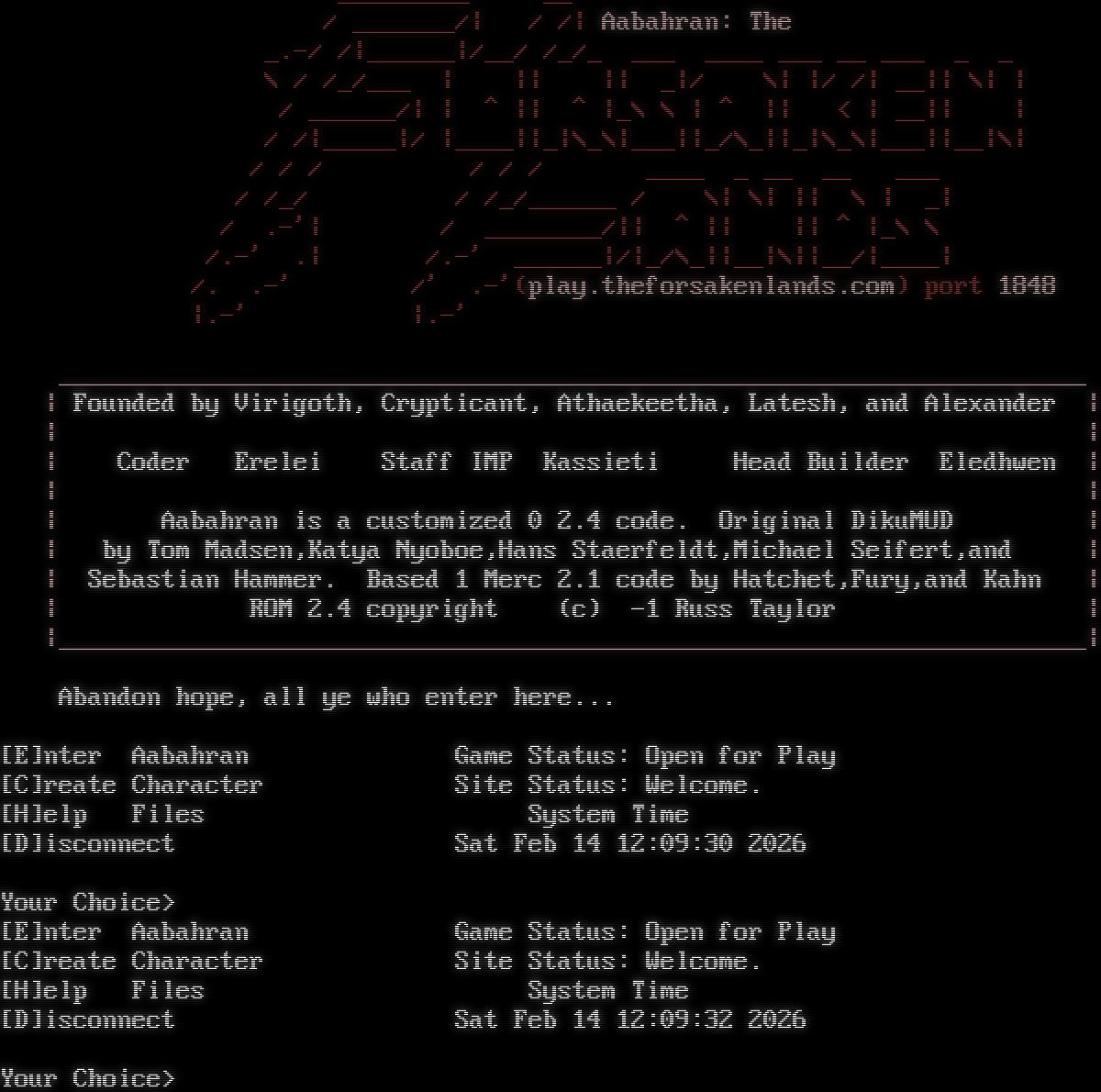 _​________ __ / _​______/\| / /\| Aabahran: The _.-/ /\|_​_____\|/__/ /_/_ ___ _​___ ___ __ ___ _ _ \\ / /_/___ \| \|\| \|\| _\|/ \\\| \|/ /\| __\|\| \\\| \| / _​_____/\| \| ^ \|\| ^ \|_\\ \\ \| ^ \|\| < \| __\|\| \| / /\|_​____\|/ \|_​___\|\|_\|\\_\\\|___\|\|_/\\_\|\|_\|\\_\\\|___\|\|__\|\\\| / / / / / / _​___ _ __ __ ___ / /_/ / /_/_​_____ / \\\| \\\| \|\| \\ \| _\| / .-'\| / _​_______/\|\| ^ \|\| \|\| ^ \|_\\ \\ /.-' .\| /.-' _​_____\|/\|_/\\_\|\|__\|\\\|\|__/\|_​___\| /. .-' /' .-'(play.theforsakenlands.com) port 1848 \|.-' \|.-' _​_____________________________________________________________________ \| Founded by Virigoth, Crypticant, Athaekeetha, Latesh, and Alexander \| \| \| \| Coder Erelei Staff IMP Kassieti Head Builder Eledhwen \| \| \| \| Aabahran is a customized 0 2.4 code. Original DikuMUD \| \| by Tom Madsen,Katya Nyoboe,Hans Staerfeldt,Michael Seifert,and \| \| Sebastian Hammer. Based 1 Merc 2.1 code by Hatchet,Fury,and Kahn \| \| ROM 2.4 copyright (c) -1 Russ Taylor \| \|_​_____________________________________________________________________\| Abandon hope, all ye who enter here... [E]nter Aabahran Game Status: Open for Play [C]reate Character Site Status: Welcome. [H]elp Files System Time [D]isconnect Sat Feb 14 12:09:30 2026 Your Choice> [E]nter Aabahran Game Status: Open for Play [C]reate Character Site Status: Welcome. [H]elp Files System Time [D]isconnect Sat Feb 14 12:09:32 2026 Your Choice>