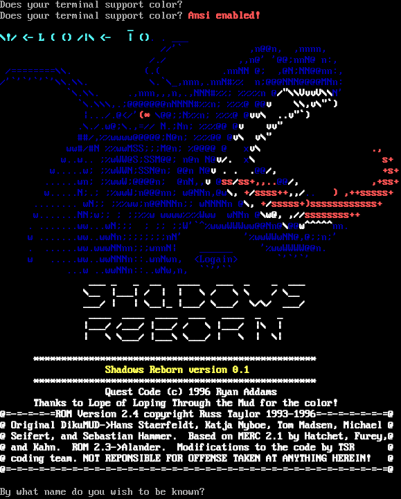 Does your terminal support color? Does your terminal support color? Ansi enabled! _ \\!/ <- L ( () /\|\\ <- \| (). . ___ //'\` ,n@@n, ,nnnn, /./ ,,n@' '@@;nnN@ n:, /=​=======\\\\. (.( .nnNN @; ,@N;NN@@nn:, /'\`'\`'\`'\`'\\\\.\\\\. \\.\`\\_,nnn,.nnN#%% n;@@@NNN@@@@MNn: \`\\.\\\\. .,nnn,,,n,.,NNN#%%; %%%%n @/"\\\\VvvV\\\\N' \`\\.\\\\\\,.;@@@@@@@nNNNN#%%n; %%%@ @@v \\\\,v\\"\`) \|.../.@</'(\* \\@@;;N%%n; %%%@ @vv\\ ..v"\`) .\\./.w@;\\.,=// N.;Nn; %%%@@ @v vv" ##/,%%wwww@@@@@;N@n; %%%@@ @v\\ v\\" ww#/#N %%wwMSS;;;M@n; %@@@@ @ xv\\ ., w..w.. ;%wWW@S;SSM@@; n@n N@v/. x\\ s+ w.​....w; ;%wWWN;SSN@n; @@n N@v . . .@@/, +s+ .​.....wn; ;%wwW;@@@@n; @nN,,v @ss/ss+,,..@@/, ,+ss+ w.​....N;.; ;%wwW;n@@@nn; w@NNn,@w\\, +/ssss++,,/.. ) ,++sssss+ .​....... wN;; ;%%ww;n@@NNNn;; wNNNNn @\\, +/sssss+)ssssssssssss+ w.​......NN;w;; ; ;;%%w wwww%%%Www wNNn @\\w@, ,//ssssssss++ . .​......ww...wN;;; ; ;; ;;W'\`^%wwwWWWww@@Nn@\\@@w^​^^^^nn. w .​......ww..wwNn;;;;;;;;nN' '%wwWWwNN@,@;;n;' . .​.....ww.wwwNNnn;;;wnnN\| _​_____ '%wwWWWW@@n. w .​....ww..wwNNNn::.wnNwn, <Logain> \`'\`'\`' ...w ..wwNNn::..wNw,n, \`\`''\`\` ___ _ _ __ _​___ ___ _ _ ___ \\__ \|___\| / \| \| \\ / \\ \\ / \\__ ___/ \| \| \\__\|_ \|___/ \\___/ \\/\\/ ___/ _​___ _​___ _​___ ___ _​___ _ _ \|___/ /___/ \|___/ / \\ \|___/ \|\\ \| \| \\ \\___/ \|___\\ \\___/ \| \\ \| \\\| \*\*\*\*\*\*\*\*\*\*\*\*\*\*\*\*\*\*\*\*\*\*\*\*\*\*\*\*\*\*\*\*\*\*\*\*\*\*\*\*\*\*\*\*\*\*\*\*\*\*\* Shadows Reborn version 0.1 \*\*\*\*\*\*\*\*\*\*\*\*\*\*\*\*\*\*\*\*\*\*\*\*\*\*\*\*\*\*\*\*\*\*\*\*\*\*\*\*\*\*\*\*\*\*\*\*\*\*\* Quest Code (c) 1996 Ryan Addams Thanks to Lope of Loping Through the Mud for the color! @=​-=-=-=-=ROM Version 2.4 copyright Russ Taylor 1993-1996=​-=-=-=-=-=-=@ @ Original DikuMUD->Hans Staerfeldt, Katja Nyboe, Tom Madsen, Michael @ @ Seifert, and Sebastian Hammer. Based on MERC 2.1 by Hatchet, Furey,@ @ and Kahn. ROM 2.3->Alander. Modifications to the code by TSR @ @ coding team. NOT REPONSIBLE FOR OFFENSE TAKEN AT ANYTHING HEREIN! @ @=​-=-=-=-=-=-=-=-=-=-=-=-=-=-=-=-=-=-=-=-=-=-=-=-=-=-=-=-=-=-=-=-=-=-=@ By what name do you wish to be known?