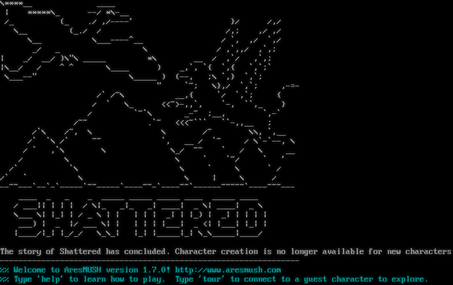 \\\*\*\*\*__ _​___ \| \*\*\*\*\*\\_ --/ \*\\-__ /_ (_ ./ ,/-​---' }/ /,/ \\__ (_./ / /,; ,/ ,/ \\__ \\_​__----^__ / \`, ,/ \`,/ _/ _ \\ / ,\`,,/ ,\`,; \| _/ __/ )\\"\\ _​____ \*\\ __ / ,\`/ ,\`,; \|\\__/ / ^ ^ \\_​___ ) _,\`, \`{ \`,{ \`,\`;\` \\_​__--" \\_​____ ) (--, ;\\ \`,} \`,\`; " \`~; \\},/ \`,\`; ,-=- /\` /~\\ __,{ \`/ \`,\`; { / \` \\_ <<~>-,,\`, \`-, \`\`,_ } / \`~\`\\ _-~ ;__, \`,-\` /~~ .\`~ <<<~\`\`\` \`\`-,,__ ; /\`\\ /~, \\ \\ /~ \\\\, \`,__ /\` \`\\ /\` ~~ \`, __ / \`~ / \\\`-\`--, \\ / \` ,\`\\ \\ \\_/ ~~ \` / \\ __ / \\ \\ \` \`~/ \` ' /\` \`\\ \\ \` \\ \` / /\` \` \\ \\ \| \\ / -​-~~---\`--\`-\`-​----\`~​~-----\`-​---~~-\`-​---~~\`-​-----~~~~~\`-​---~~~--- _​___ _ _ _ _​____ _​____ _​____ _​___ _​____ _​___ / ___\|\| \| \| \| / \\\|_ _\|_ _\| _​___\| _ \\\| _​___\| _ \\ \\___ \\\| \|_\| \| / _ \\ \| \| \| \| \| _\| \| \|_) \| _\| \| \| \| \| ___) \| _ \|/ ___ \\\| \| \| \| \| \|___\| _ <\| \|___\| \|_\| \| \|_​___/\|_\| \|_/_/ \\_\\_\| \|_\| \|_​____\|_\| \\_\\_​____\|_​___/ The story of Shattered has concluded. Character creation is no longer available for new characters -​---------------------------------------------------------------- %% Welcome to AresMUSH version 1.7.0! http://www.aresmush.com %% Type 'help' to learn how to play. Type 'tour' to connect to a guest character to explore.