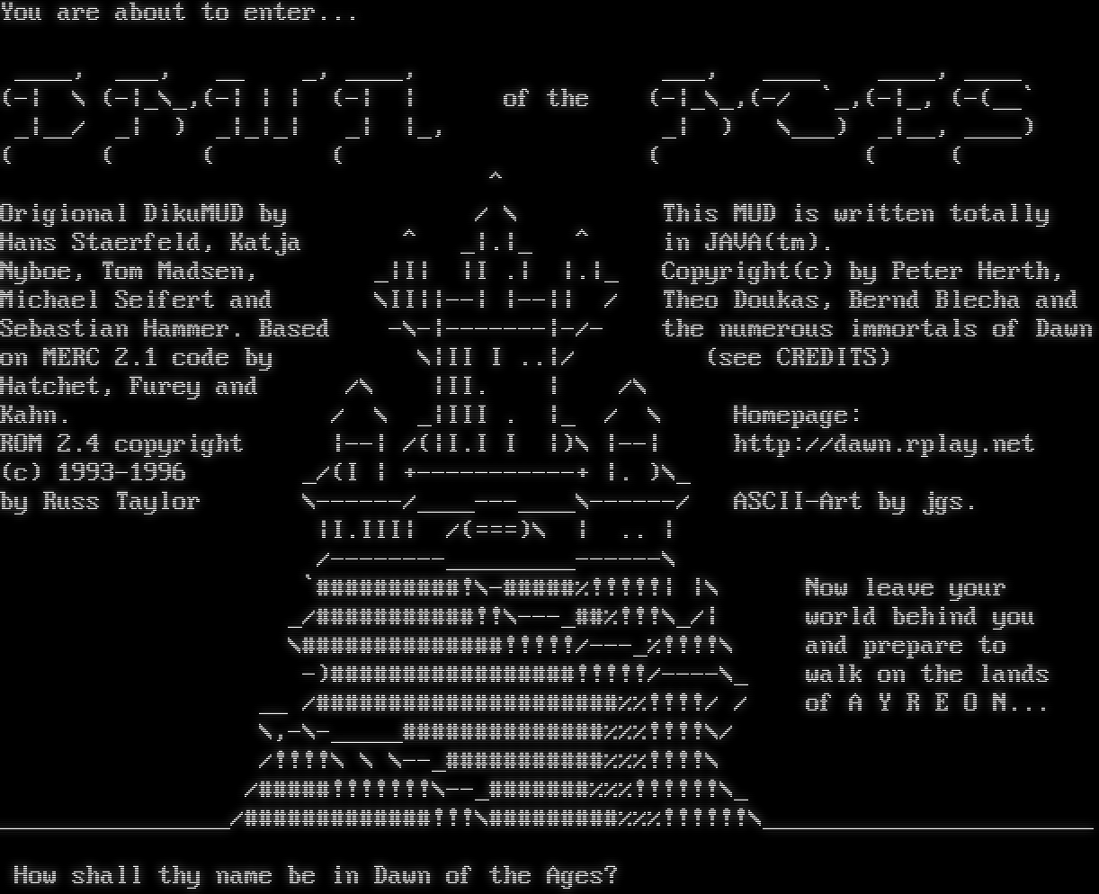 You are about to enter... _​___, ___, __ _, _​___, ___, _​___ _​___, _​___ (-\| \\ (-\|_\\_,(-\| \| \| (-\| \| of the (-\|_\\_,(-/ \`_,(-\|_, (-(__\` _\|__/ _\| ) _\|_\|_\| _\| \|_, _\| ) \\___) _\|__, _​___) ( ( ( ( ( ( ( ^ Origional DikuMUD by / \\ This MUD is written totally Hans Staerfeld, Katja ^ _\|.\|_ ^ in JAVA(tm). Nyboe, Tom Madsen, _\|I\| \|I .\| \|.\|_ Copyright(c) by Peter Herth, Michael Seifert and \\II\|\|--\| \|--\|\| / Theo Doukas, Bernd Blecha and Sebastian Hammer. Based -\\-\|-​------\|-/- the numerous immortals of Dawn on MERC 2.1 code by \\\|II I ..\|/ (see CREDITS) Hatchet, Furey and /\\ \|II. \| /\\ Kahn. / \\ _\|III . \|_ / \\ Homepage: ROM 2.4 copyright \|--\| /(\|I.I I \|)\\ \|--\| http://dawn.rplay.net (c) 1993-1996 _/(I \| +​-----------+ \|. )\\_ by Russ Taylor \\-​-----/_​___---____\\-​-----/ ASCII-Art by jgs. \|I.III\| /(===)\\ \| .. \| /-​-------_________------\\ \`#​#########!\\-​#####%!!!!!\| \|\\ Now leave your _/#​##########!!\\-​--_##%!!!\\_/\| world behind you \\#​#############!!!!!/-​--_%!!!!\\ and prepare to -)#​################!!!!!/-​---\\_ walk on the lands __ /#​####################%%!!!!/ / of A Y R E O N... \\,-\\-​_____##############%%%!!!!\\/ /!!!!\\ \\ \\-​-_###########%%%!!!!\\ /#​####!!!!!!!\\-​-_#######%%%!!!!!!\\_ _​_______________/#​############!!!\\#​########%%%!!!!!!\\_​______________________ How shall thy name be in Dawn of the Ages?