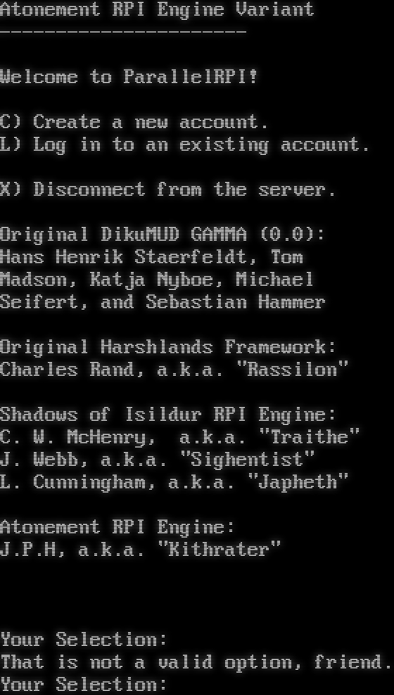 Atonement RPI Engine Variant -​--------------------- Welcome to ParallelRPI! C) Create a new account. L) Log in to an existing account. X) Disconnect from the server. Original DikuMUD GAMMA (0.0): Hans Henrik Staerfeldt, Tom Madson, Katja Nyboe, Michael Seifert, and Sebastian Hammer Original Harshlands Framework: Charles Rand, a.k.a. "Rassilon" Shadows of Isildur RPI Engine: C. W. McHenry, a.k.a. "Traithe" J. Webb, a.k.a. "Sighentist" L. Cunningham, a.k.a. "Japheth" Atonement RPI Engine: J.P.H, a.k.a. "Kithrater" Your Selection: That is not a valid option, friend. Your Selection: