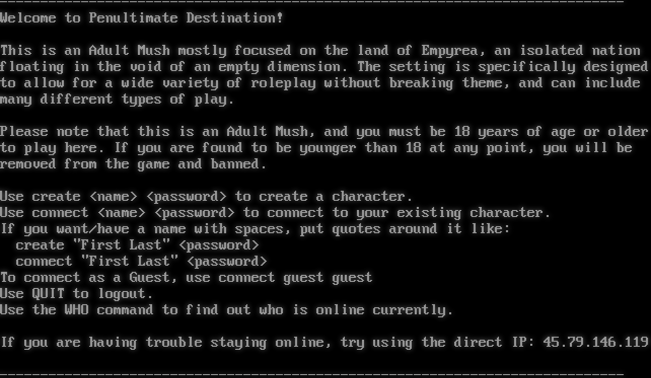 -​---------------------------------------------------------------------------- Welcome to Penultimate Destination! This is an Adult Mush mostly focused on the land of Empyrea, an isolated nation floating in the void of an empty dimension. The setting is specifically designed to allow for a wide variety of roleplay without breaking theme, and can include many different types of play. Please note that this is an Adult Mush, and you must be 18 years of age or older to play here. If you are found to be younger than 18 at any point, you will be removed from the game and banned. Use create <name> <password> to create a character. Use connect <name> <password> to connect to your existing character. If you want/have a name with spaces, put quotes around it like: create "First Last" <password> connect "First Last" <password> To connect as a Guest, use connect guest guest Use QUIT to logout. Use the WHO command to find out who is online currently. If you are having trouble staying online, try using the direct IP: 45.79.146.119 -​----------------------------------------------------------------------------