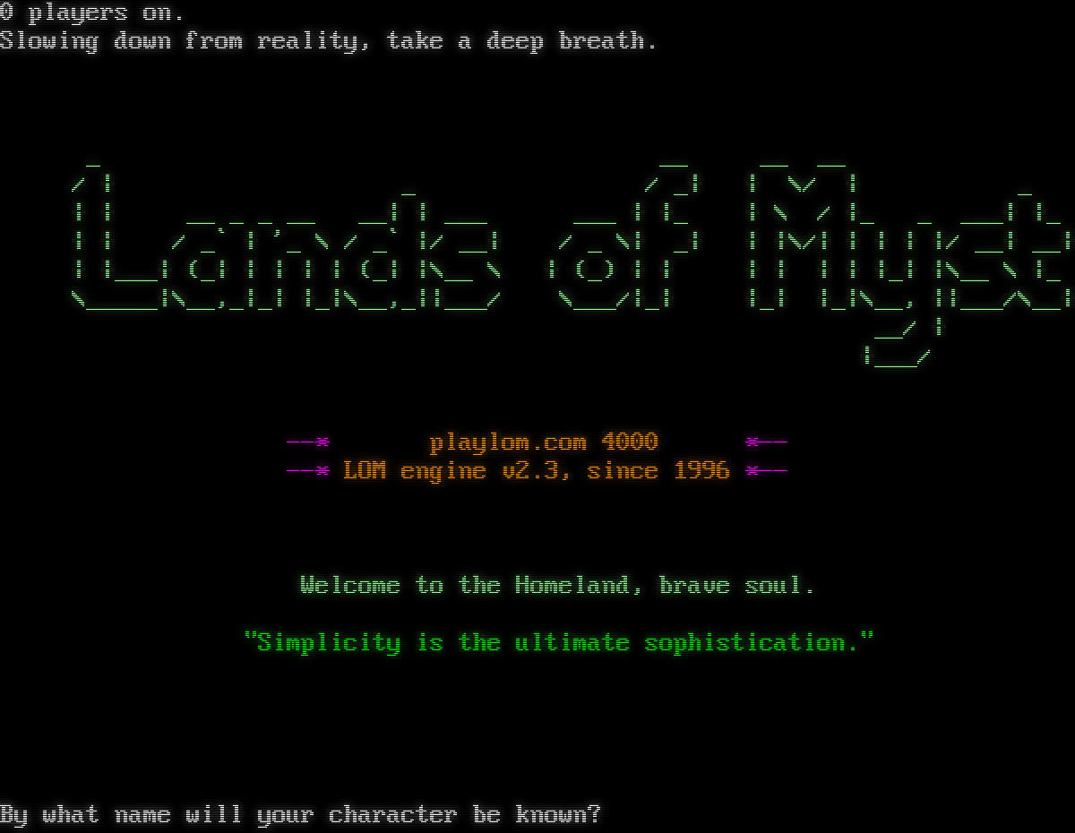 0 players on. Slowing down from reality, take a deep breath. _ __ __ __ / \| _ / _\| \| \\/ \| _ \| \| __ _ _ __ __\| \| ___ ___ \| \|_ \| \\ / \|_ _ ___\| \|_ \| \| / _\` \| '_ \\ / _\` \|/ __\| / _ \\\| _\| \| \|\\/\| \| \| \| \|/ __\| __\| \| \|___\| (_\| \| \| \| \| (_\| \|\\__ \\ \| (_) \| \| \| \| \| \| \|_\| \|\\__ \\ \|_ \\_​____\|\\__,_\|_\| \|_\|\\__,_\|\|___/ \\___/\|_\| \|_\| \|_\|\\__, \|\|___/\\__\| __/ \| \|___/ --\* playlom.com 4000 \*-- --\* LOM engine v2.3, since 1996 \*-- Welcome to the Homeland, brave soul. "Simplicity is the ultimate sophistication." By what name will your character be known?