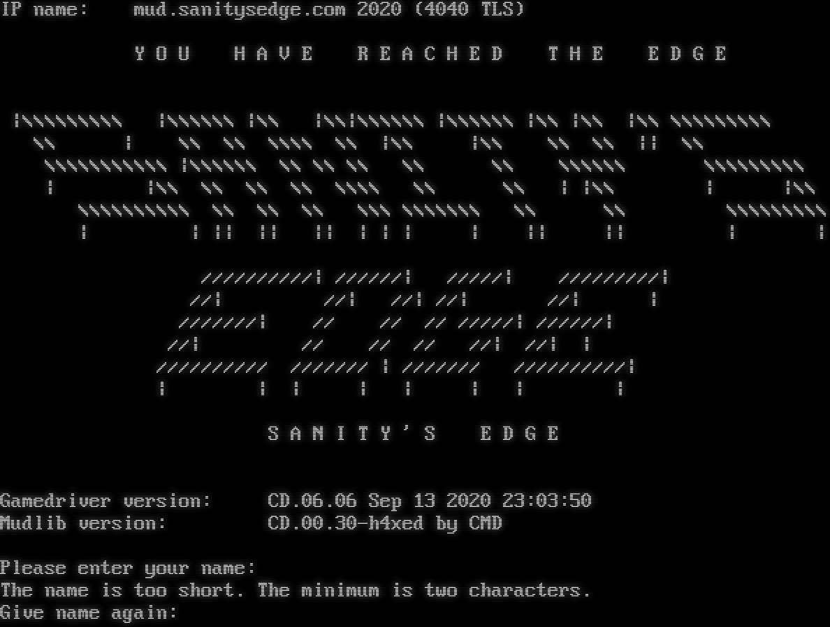 IP name: mud.sanitysedge.com 2020 (4040 TLS) Y O U H A V E R E A C H E D T H E E D G E \|\\\\\\\\\\\\\\\\\\ \|\\\\\\\\\\\\ \|\\\\ \|\\\\\|\\\\\\\\\\\\ \|\\\\\\\\\\\\ \|\\\\ \|\\\\ \|\\\\ \\\\\\\\\\\\\\\\\\ \\\\ \| \\\\ \\\\ \\\\\\\\ \\\\ \|\\\\ \|\\\\ \\\\ \\\\ \|\| \\\\ \\\\\\\\\\\\\\\\\\\\\\ \|\\\\\\\\\\\\ \\\\ \\\\ \\\\ \\\\ \\\\ \\\\\\\\\\\\ \\\\\\\\\\\\\\\\\\ \| \|\\\\ \\\\ \\\\ \\\\ \\\\\\\\ \\\\ \\\\ \| \|\\\\ \| \|\\\\ \\\\\\\\\\\\\\\\\\\\ \\\\ \\\\ \\\\ \\\\\\ \\\\\\\\\\\\\\ \\\\ \\\\ \\\\\\\\\\\\\\\\\\ \| \| \|\| \|\| \|\| \| \| \| \| \|\| \|\| \| \| //////////\| //////\| /////\| /////////\| //\| //\| //\| //\| //\| \| ///////\| // // // /////\| //////\| //\| // // // //\| //\| \| ////////// /////// \| /////// //////////\| \| \| \| \| \| \| \| \| S A N I T Y ' S E D G E Gamedriver version: CD.06.06 Sep 13 2020 23:03:50 Mudlib version: CD.00.30-h4xed by CMD Please enter your name: The name is too short. The minimum is two characters. Give name again: