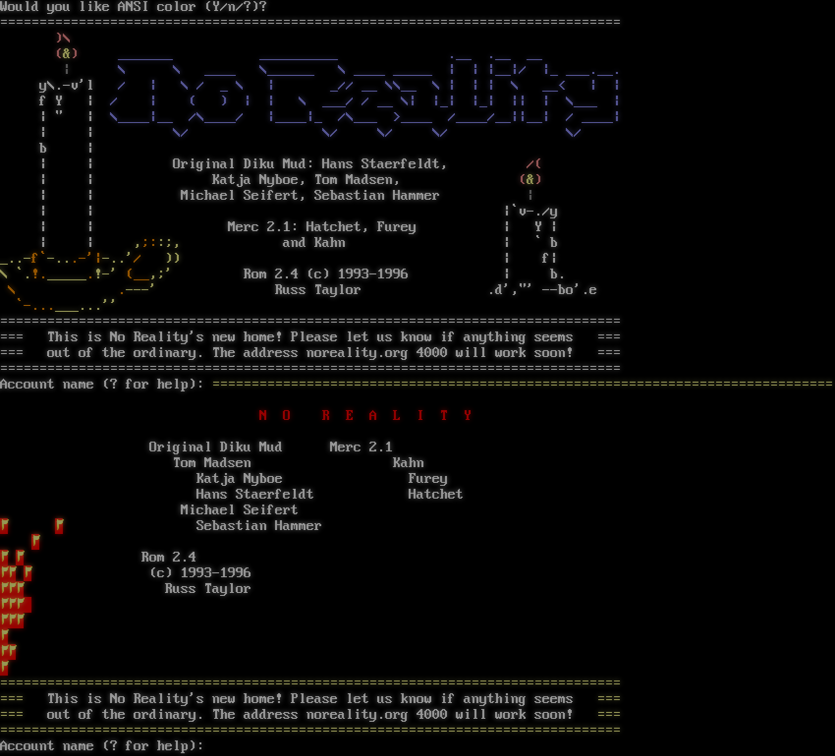 Would you like ANSI color (Y/n/?)? =​============================================================================== )\\ (&) _​______ _​_________ .__ .__ __ \| \\ \\ _​___ \\_​_____ \\ _​___ _​____ \| \| \|__\|/ \|_ _​__.__. y\\.-v'l / \| \\ / _ \\ \| _// __ \\\\__ \\ \| \| \| \\ __< \| \| f Y \| / \| ( ) \| \| \\ ___/ / __ \\\| \|_\| \|_\| \|\| \| \\___ \| \| " \| \\_​___\|__ /\\_​___/ \|_​___\|_ /\\___ >_​___ /_​___/__\|\|__\| / _​___\| \| \| \\/ \\/ \\/ \\/ \\/ b \| \| \| Original Diku Mud: Hans Staerfeldt, /( \| \| Katja Nyboe, Tom Madsen, (&) \| \| Michael Seifert, Sebastian Hammer \| \| \| \|\`v-./y \| \| Merc 2.1: Hatchet, Furey \| Y \| \| \| ,;::;, and Kahn \| \` b _​..-f\`-​...-'\|-..'/ )) \| f\| \\ \`.!.​_____.!-' (__,;' Rom 2.4 (c) 1993-1996 \| b. \\ .​---' Russ Taylor .d',"' --bo'.e \`-​...___...'' =​============================================================================== === This is No Reality's new home! Please let us know if anything seems === === out of the ordinary. The address noreality.org 4000 will work soon! === =​============================================================================== Account name (? for help): =​============================================================================== N O R E A L I T Y Original Diku Mud Merc 2.1 Tom Madsen Kahn Katja Nyboe Furey Hans Staerfeldt Hatchet Michael Seifert ۲ ۲ Sebastian Hammer ۲ ۲ ۲ Rom 2.4 ۲۲ ۲ (c) 1993-1996 ۲۲۲ Russ Taylor ۲۲۲ ۲۲۲ ۲ ۲۲ ۲ =​============================================================================== === This is No Reality's new home! Please let us know if anything seems === === out of the ordinary. The address noreality.org 4000 will work soon! === =​============================================================================== Account name (? for help):