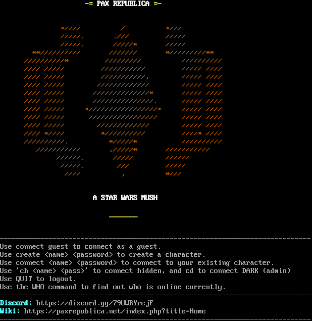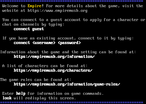 =​============================================================= Welcome to Empire! For more details about the game, visit the website at https://www.empiremush.org You can connect to a guest account to apply for a character or chat on channels by typing: connect guest If you have an existing account, connect to it by typing: connect &lt;username&gt; &lt;password&gt; Information about the game and the setting can be found at: https://empiremush.org/information/ A list of characters can be found at: https://empiremush.org/characters/ The game rules can be found at: https://empiremush.org/information/game-rules/ Enter help for information on game commands. look will redisplay this screen. =​=============================================================