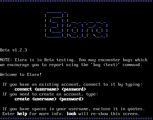 =​============================================================= _​_____ _ \| _​___\| \| \| \|__ \| \| __ _ _ __ __ _ \| __\| \| \|/ _\` \| '__/ _\` \| \| \|_​___\| \| (_\| \| \| \| (_\| \| \|_​_____\|_\|\\__,_\|_\| \\__,_\| Beta v1.2.3 NOTE: Elara is in Beta testing. You may encounter bugs which we encourage you to report using the 'bug &lt;text&gt;' command. Welcome to Elara! If you have an existing account, connect to it by typing: connect &lt;username&gt; &lt;password&gt; If you need to create an account, type: create &lt;username&gt; &lt;password&gt; If you have spaces in your username, enclose it in quotes. Enter help for more info. look will re-show this screen. =​=============================================================