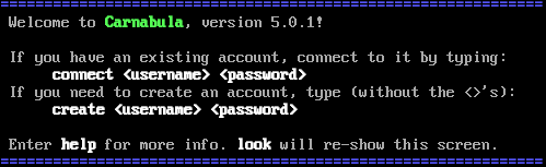 =​============================================================= Welcome to Carnabula, version 5.0.1! If you have an existing account, connect to it by typing: connect &lt;username&gt; &lt;password&gt; If you need to create an account, type (without the &lt;&gt;'s): create &lt;username&gt; &lt;password&gt; Enter help for more info. look will re-show this screen. =​=============================================================