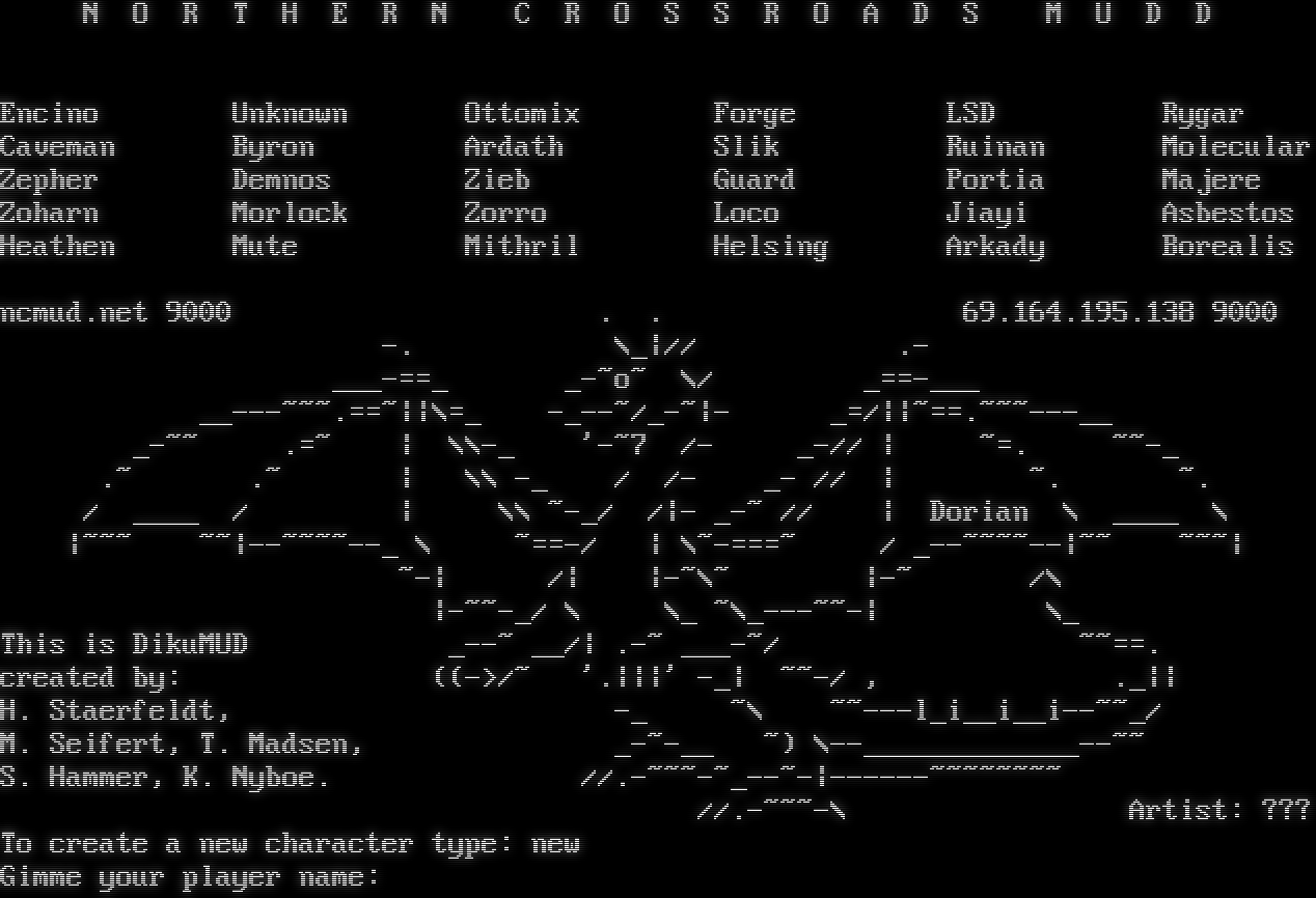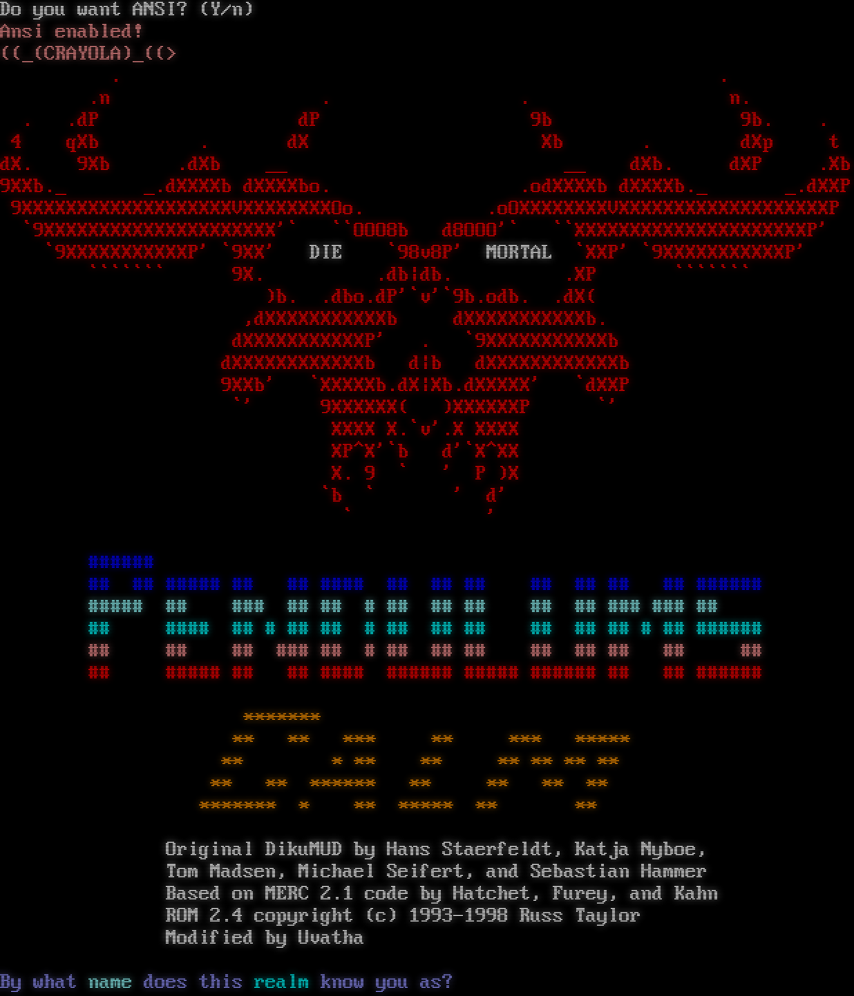 Do you want ANSI? (Y/n) Ansi enabled! ((_(CRAYOLA)_((> . . .n . . n. . .dP dP 9b 9b. . 4 qXb . dX Xb . dXp t dX. 9Xb .dXb __ __ dXb. dXP .Xb 9XXb._ _.dXXXXb dXXXXbo. .odXXXXb dXXXXb._ _.dXXP 9XXXXXXXXXXXXXXXXXXXVXXXXXXXXOo. .oOXXXXXXXXVXXXXXXXXXXXXXXXXXXXP \`9XXXXXXXXXXXXXXXXXXXXX'\` \`\`OOO8b d8OOO'\` \`\`XXXXXXXXXXXXXXXXXXXXXP' \`9XXXXXXXXXXXP' \`9XX' DIE \`98v8P' MORTAL \`XXP' \`9XXXXXXXXXXXP' \`\`\`\`\`\`\` 9X. .db\|db. .XP \`\`\`\`\`\`\` )b. .dbo.dP'\`v'\`9b.odb. .dX( ,dXXXXXXXXXXXb dXXXXXXXXXXXb. dXXXXXXXXXXXP' . \`9XXXXXXXXXXXb dXXXXXXXXXXXXb d\|b dXXXXXXXXXXXXb 9XXb' \`XXXXXb.dX\|Xb.dXXXXX' \`dXXP \`' 9XXXXXX( )XXXXXXP \`' XXXX X.\`v'.X XXXX XP^X'\`b d'\`X^XX X. 9 \` ' P )X \`b \` ' d' \` ' #​##### ## ## #​#### ## ## #​### ## ## ## ## ## ## ## #​##### #​#### ## ### ## ## # ## ## ## ## ## ### ### ## ## #​### ## # ## ## # ## ## ## ## ## ## # ## #​##### ## ## ## ### ## # ## ## ## ## ## ## ## ## ## #​#### ## ## #​### #​##### #​#### #​##### ## ## #​##### \*\*\*\*\*\*\* \*\* \*\* \*\*\* \*\* \*\*\* \*\*\*\*\* \*\* \* \*\* \*\* \*\* \*\* \*\* \*\* \*\* \*\* \*\*\*\*\*\* \*\* \*\* \*\* \*\* \*\*\*\*\*\*\* \* \*\* \*\*\*\*\* \*\* \*\* Original DikuMUD by Hans Staerfeldt, Katja Nyboe, Tom Madsen, Michael Seifert, and Sebastian Hammer Based on MERC 2.1 code by Hatchet, Furey, and Kahn ROM 2.4 copyright (c) 1993-1998 Russ Taylor Modified by Uvatha By what name does this realm know you as?