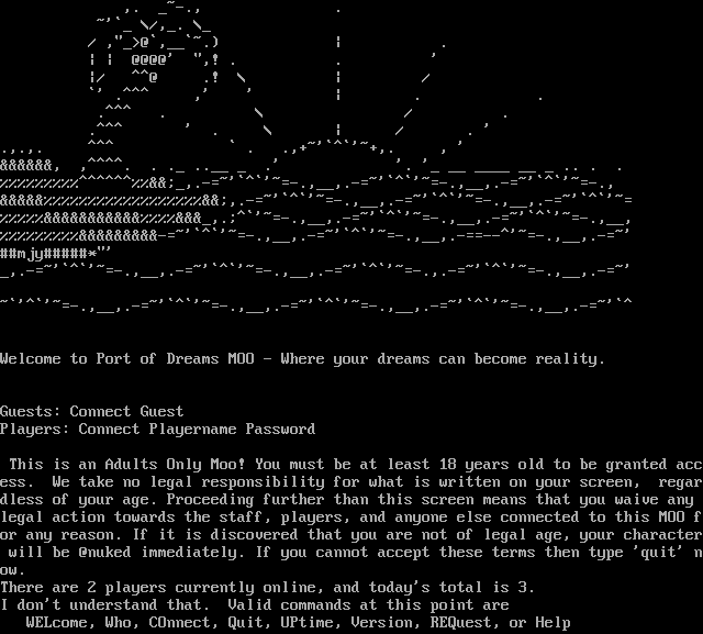 ,. _​~-., . ~'\`_ \\/,_. \\_ / ,"_>@\`,__\`~.) \| . \| \| @@@@' ",! . . ' \|/ ^^@ .! \\ \| / \`' .​^^^ ,' ' \| . . .​^^^ . \\ / . .​^^^ ' . \\ \| / . ' .,.,. ^^^ \` . .,+~'\`^\`'~+,. , ' &&&&&&, ,^​^^^. . ._ .​.__ _ .' '. '_ __ _​___ __ _ .. . . %%%%%%%%%^​^^^^^%%&&;_,.​-=~'\`^\`'~​=-.,__,.​-=~'\`^\`'~​=-.,__,.​-=~'\`^\`'~​=-., &&&&&%%%%%%%%%%%%%%%%%%&&;,.​-=~'\`^\`'~​=-.,__,.​-=~'\`^\`'~​=-.,__,.​-=~'\`^\`'~= %%%%%&&&&&&&&&&&%%%%&&&_,.;^\`'~​=-.,__,.​-=~'\`^\`'~​=-.,__,.​-=~'\`^\`'~​=-.,__, %%%%%%%%%&&&&&&&&&-=~'\`^\`'~​=-.,__,.​-=~'\`^\`'~​=-.,__,.​-==--^'~​=-.,__,.​-=~' ##mjy#​####\*"' _,.​-=~'\`^\`'~​=-.,__,.​-=~'\`^\`'~​=-.,__,.​-=~'\`^\`'~​=-.,.​-=~'\`^\`'~​=-.,__,.​-=~' ~\`'^\`'~​=-.,__,.​-=~'\`^\`'~​=-.,__,.​-=~'\`^\`'~​=-.,__,.​-=~'\`^\`'~​=-.,__,.​-=~'\`^ Welcome to Port of Dreams MOO - Where your dreams can become reality. Guests: Connect Guest Players: Connect Playername Password This is an Adults Only Moo! You must be at least 18 years old to be granted access. We take no legal responsibility for what is written on your screen, regardless of your age. Proceeding further than this screen means that you waive any legal action towards the staff, players, and anyone else connected to this MOO for any reason. If it is discovered that you are not of legal age, your character will be @nuked immediately. If you cannot accept these terms then type 'quit' now. There are 2 players currently online, and today's total is 3. I don't understand that. Valid commands at this point are WELcome, Who, COnnect, Quit, UPtime, Version, REQuest, or Help