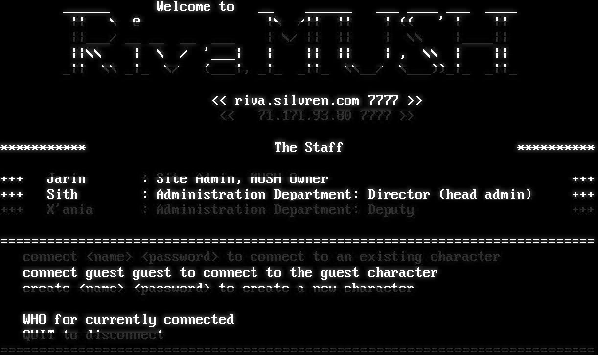 _​_____ Welcome to __ _​_____ ___ _​___ ___ _​___ \|\| \\ @ \|\\ /\|\| \|\| \| (( ' \| \|\| \|\|___/ __ __ __ ___ \| \\/ \|\| \|\| \| \\\\ \|_​___\|\| \|\|\\\\ \| \\ / '___\| \| \|\| \|\| \| , \\\\ \| \|\| _\|\| \\\\ _\|_ \\/ (___\|, _\|_ _\|\|_ \\\\__/ \\___))_\|_ _\|\|_ << riva.silvren.com 7777 >> << 71.171.93.80 7777 >> \*\*\*\*\*\*\*\*\*\*\* The Staff \*\*\*\*\*\*\*\*\*\* +++ Jarin : Site Admin, MUSH Owner +++ +++ Sith : Administration Department: Director (head admin) +++ +++ X'ania : Administration Department: Deputy +++ =​=========================================================================== connect <name> <password> to connect to an existing character connect guest guest to connect to the guest character create <name> <password> to create a new character WHO for currently connected QUIT to disconnect =​===========================================================================