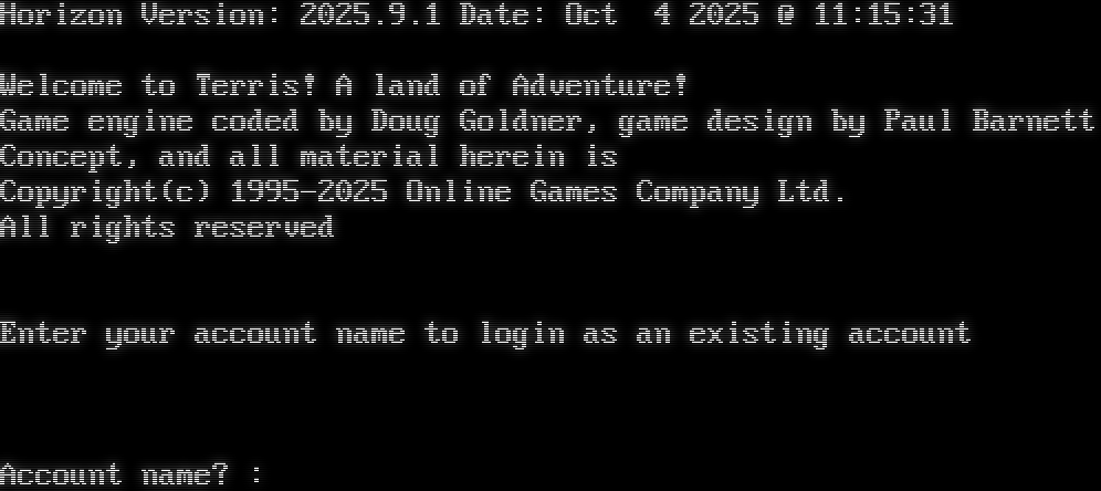 Horizon Version: 2025.9.1 Date: Oct 4 2025 @ 11:15:31 Welcome to Terris! A land of Adventure! Game engine coded by Doug Goldner, game design by Paul Barnett Concept, and all material herein is Copyright(c) 1995-2025 Online Games Company Ltd. All rights reserved Enter your account name to login as an existing account Account name? : <!el rvnum flag="RoomNum" tag="20"><!el rname flag="RoomName"><!el rdesc flag="RoomDesc"><!el rexit '<send "&text;\|glance &text;" hint="Move &text;\|Move &text;\|Glance &text;" expire="move">' att="text" flag="RoomExit"><!el rshop '<send "describe &item;\|buy &item;" hint="Shop Menu\|Describe &text;\|Buy &text;" expire="move">' att="item"><!el rsign '<send "read sign" expire="move">'><!el rshow '<send "&text;" expire="move">'><!el shstable '<send "show stables" >'><!el shquest '<send "show quests" >'><!el shpsell '<send "show items" >'><!el shpspell '<send "show spells">'><!el shpskill '<send "show skills">'><!el shpserv '<send "show services">'><!tag 20 gag><!ELEMENT Prompt FLAG='Prompt'><!ELEMENT Hp FLAG='Set hp'><!ELEMENT MaxHp FLAG='Set maxhp'><!ELEMENT Sp FLAG='Set mana'><!ELEMENT MaxSp FLAG='Set maxmana'><!ELEMENT Get "<send href='get &#39;&name;&#39;\|examine &#39;&name;&#39;\|drink &#39;&name;&#39;' hint='RH mouse click to use this object\|Get &desc;\|Examine &desc;\|Drink from &desc;'>" ATT='name desc'><!ELEMENT Drop "<send href='drop &#39;&name;&#39;\|examine &#39;&name;&#39;\|look in &#39;&name;&#39;\|wear &#39;&name;&#39;\|eat &#39;&name;&#39;\|drink &#39;&name;&#39;' hint='RH mouse click to use this object\|Drop &desc;\|Examine &desc;\|Look inside &desc;\|Wear &desc;\|Eat &desc;\|Drink &desc;'>" ATT='name desc'><!ELEMENT Bid "<send href='bid &#39;&name;&#39;' hint='Bid for &desc;'>" ATT='name desc'><!ELEMENT List "<send href='buy &#39;&name;&#39;' hint='Buy &desc;'>" ATT='name desc'><!ELEMENT Player "<send href='tell &#39;&name;&#39; ' hint='Send a message to &name;' prompt>" ATT='name'>