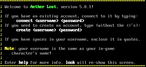 ~​~~~~~~~~~~~~~~~~~~~~~~~~~~~~~~~~~~~~~~~~~~~~~~~~~~~~~~~~~~~~~ ; Welcome to Aether Lost, version 5.0.1! ; ; If you have an existing account, connect to it by typing: ; connect &lt;username&gt; &lt;password&gt; ; If you need to create an account, type (without the &lt;&gt;'s): ; create &lt;username&gt; &lt;password&gt; ; ; If you have spaces in your username, enclose it in quotes. ; ; Note: your username is the same as your in-game ; character's name! ; ; Enter help for more info. look will re-show this screen. ~​~~~~~~~~~~~~~~~~~~~~~~~~~~~~~~~~~~~~~~~~~~~~~~~~~~~~~~~~~~~~~