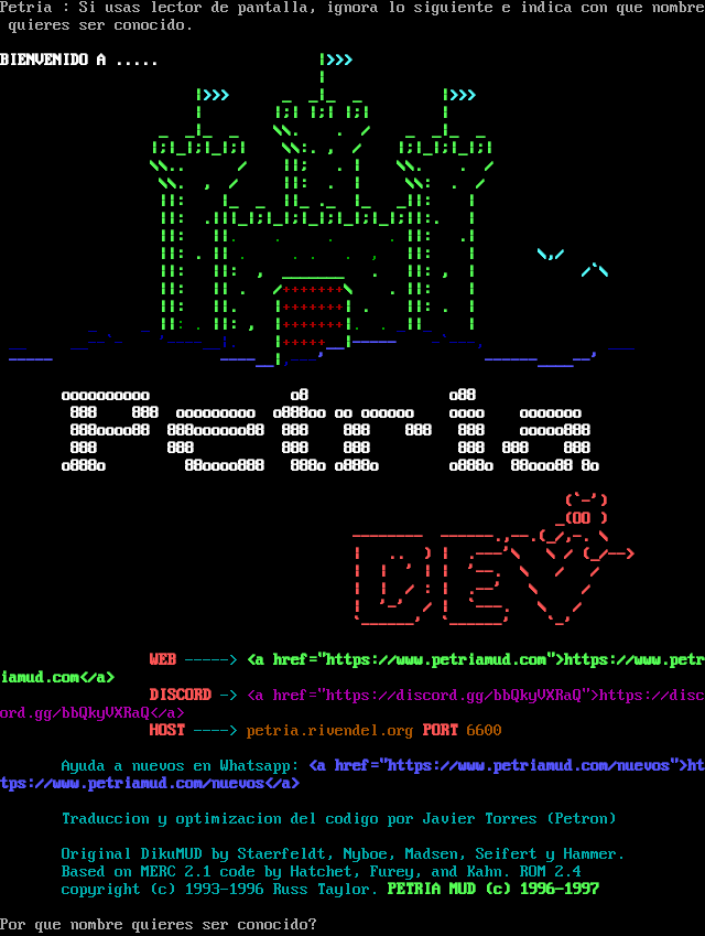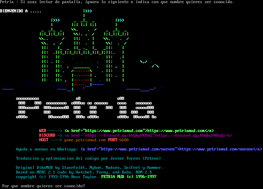 Petria : Si usas lector de pantalla, ignora lo siguiente e indica con que nombre quieres ser conocido. BIENVENIDO A .​.... \|>>> \| \|>>> _ _\|_ _ \|>>> \| \|;\| \|;\| \|;\| \| _ _\|_ _ \\\\. . / _ _\|_ _ \|;\|_\|;\|_\|;\| \\\\:. , / \|;\|_\|;\|_\|;\| \\\\.. / \|\|; . \| \\\\. . / \\\\. , / \|\|: . \| \\\\: . / \|\|: \|_ _ \|\|_ ._ \|_ _\|\|: \| \|\|: .\|\|\|_\|;\|_\|;\|_\|;\|_\|;\|_\|;\|\|:. \| \|\|: \|\|. . . . \|\|: .\| \|\|: . \|\| . . . . , \|\|: \| \\,/ \|\|: \|\|: , _​______ . \|\|: , \| /\`\\ \|\|: \|\| . /+​++++++\\ . \|\|: \| \|\|: \|\|. \|+​++++++\| . \|\|: . \| _ _ \|\|: . \|\|: , \|+​++++++\|. . _\|\|_ \| __ _​_--\`- '-​---__\|. \|+​++++__\|-​---- -\`---, ___ -​---- -​---__\|,---' -​-----____--' oooooooooo o8 o88 888 888 ooooooooo o888oo oo oooooo oooo ooooooo 888oooo88 888oooooo88 888 888 888 888 ooooo888 888 888 888 888 888 888 888 o888o 88oooo888 888o o888o o888o 88ooo88 8o WEB -​----> <a href="https://www.petriamud.com">https://www.petriamud.com</a> DISCORD -> <a href="https://discord.gg/bbQkyVXRaQ">https://discord.gg/bbQkyVXRaQ</a> HOST -​---> game.petriamud.com PORT 6600 Ayuda a nuevos en Whatsapp: <a href="https://www.petriamud.com/nuevos">https://www.petriamud.com/nuevos</a> Traduccion y optimizacion del codigo por Javier Torres (Petron) Original DikuMUD by Staerfeldt, Nyboe, Madsen, Seifert y Hammer. Based on MERC 2.1 code by Hatchet, Furey, and Kahn. ROM 2.4 copyright (c) 1993-1996 Russ Taylor. PETRIA MUD (c) 1996-1997 Por que nombre quieres ser conocido?