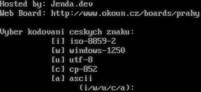 Hosted by: Jenda.dev Web Board: http://www.okoun.cz/boards/prahy Vyber kodovani ceskych znaku: [i] iso-8859-2 [w] windows-1250 [u] utf-8 [c] cp-852 [a] ascii (i/w/u/c/a):