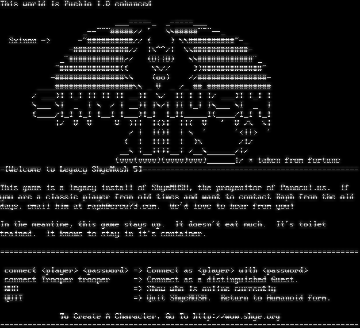 This world is Pueblo 1.0 enhanced _​__====-_ _​-====___ _​--~~~#####// ' \\\\#​####~~~--_ Sxinon -> -​~##########// ( ) \\\\#​#########~-_ -​############// \|\\^^/\| \\\\#​###########- _​~############// (O\|\|O) \\\\#​###########~_ ~​#############(( \\\\// ))#​############~ -​###############\\\\ (oo) //#​##############- _​___#################\\\\ _ V _ /_ #​#_############## / ___)I I_I II II II __)I \\/ II I I I/ ___)I I_I I \\___ \\I _ I \\ / I __)I I\\/I II I_I I\\___ \\I _ I (_​___/I_I I_I I__I I___)I_I I_II_​____I(_​___/I_I I_I \|/ V V V )\|\| \|()\| \|\|( V ' V /\\ \\\| / \| \|()\| \| \\ ' '<\|\|> ' ( \| \|()\| \| )\\ /\|/ __\\ \|__\|()\|__\| /__\\_​_____/\|/ (vvv(vvvv)(vvvv)vvv)_​_____\|/ \* taken from fortune =[Welcome to Legacy ShyeMush 5]=​============================================== This game is a legacy install of ShyeMUSH, the progenitor of Panocul.us. If you are a classic player from old times and want to contact Raph from the old days, email him at raph@crew73.com. We'd love to hear from you! In the meantime, this game stays up. It doesn't eat much. It's toilet trained. It knows to stay in it's container. =​============================================================================= connect <player> <password> => Connect as <player> with <password> connect Trooper trooper => Connect as a distinguished Guest. WHO => Show who is online currently QUIT => Quit ShyeMUSH. Return to Humanoid form. To Create A Character, Go To http://www.shye.org =​=============================================================================