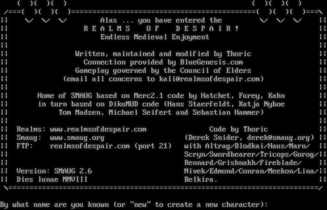( )( )( ) ( )( )( ) /===( )( )( )=​===========================================( )( )( )===\\ \|\| \\/ \\/ \\/ Alas ... you have entered the \\/ \\/ \\/ \|\| \|\| R E A L M S O F D E S P A I R ! \|\| \|\| Endless Medieval Enjoyment \|\| \|\| \|\| \|\| Written, maintained and modified by Thoric \|\| \|\| Connection provided by BlueGenesis.com \|\| \|\| Gameplay governed by the Council of Elders \|\| \|\| (email all concerns to kali@realmsofdespair.com) \|\| \|\| \|\| \|\| Home of SMAUG based on Merc2.1 code by Hatchet, Furey, Kahn \|\| \|\| in turn based on DikuMUD code (Hans Staerfeldt, Katja Nyboe \|\| \|\| Tom Madsen, Michael Seifert and Sebastian Hammer) \|\| \|\| \|\| \|\| Realms: www.realmsofdespair.com Code by Thoric \|\| \|\| Smaug: www.smaug.org (Derek Snider, derek@smaug.org) \|\| \|\| FTP: realmsofdespair.com (port 21) with Altrag/Blodkai/Haus/Narn/ \|\| \|\| Scryn/Swordbearer/Tricops/Gorog/\|\| \|\| Rennard/Grishnakh/Fireblade/ \|\| \|\| Version: SMAUG 2.6 Nivek/Edmond/Conran/Meekon/Lina/\|\| \|\| Dies lunae MMVIII Belkira. \|\| \\=​=========================================================================/ By what name are you known (or "new" to create a new character):