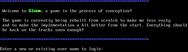 =​============================================================= Welcome to Gloom, a game in the process of conception! The game is currently being rebuilt from scratch to make me less rusty and to make the implementation a bit better from the start. Everything should be back on the tracks soon enough! =​============================================================= Enter a new or existing user name to login:
