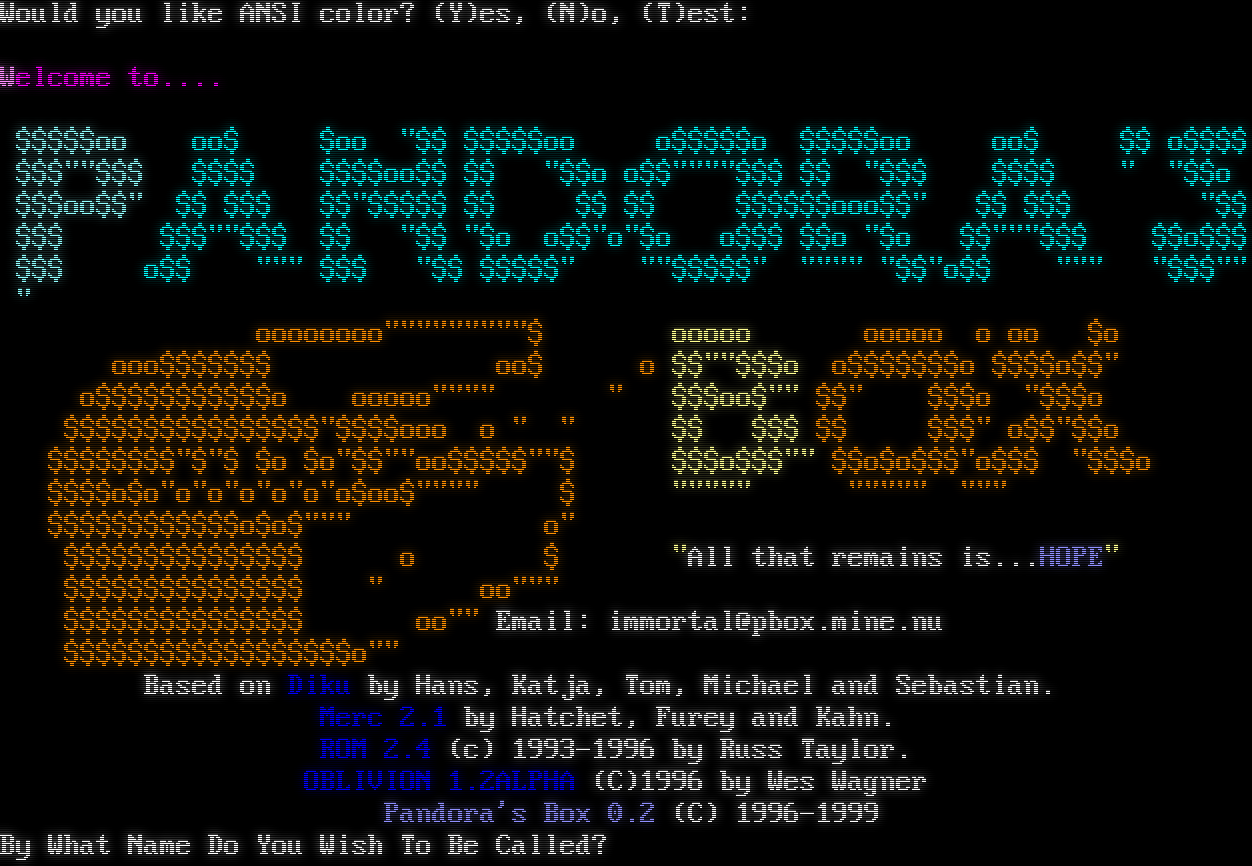 Would you like ANSI color? (Y)es, (N)o, (T)est: Welcome to.​... $$$$$oo oo$ $oo "$$ $$$$$oo o$$$$$o $$$$$oo oo$ $$ o$$$$ $$$""$$$ $$$$ $$$$oo$$ $$ "$$o o$$"​"""$$$ $$ "$$$ $$$$ " "$$o $$$oo$$" $$ $$$ $$"$$$$$ $$ $$ $$ $$$$$$ooo$$" $$ $$$ "$$ $$$ $$$""$$$ $$ "$$ "$o o$$"o"$o o$$$ $$o "$o $$"""$$$ $$o$$$ $$$ o$$ """ $$$ "$$ $$$$$" ""$$$$$" "​""" "$$"o$$ """ "$$$"" " oooooooo"​""""""""$ ooooo ooooo o oo $o ooo$$$$$$$ oo$ o $$""$$$o o$$$$$$$o $$$$o$$" o$$$$$$$$$$$o ooooo"​""" " $$$oo$"" $$" $$$o "$$$o $$$$$$$$$$$$$$$$"$$$$ooo o " " $$ $$$ $$ $$$" o$$"$$o $$$$$$$$"$"$ $o $o"$$""oo$$$$$""$ $$$o$$$"" $$o$o$$$"o$$$ "$$$o $$$$o$o"o"o"o"o"o"o$oo$"​""" $ "​"""" "​"""" """ $$$$$$$$$$$$o$o$""" o" $$$$$$$$$$$$$$$ o $ "All that remains is...HOPE" $$$$$$$$$$$$$$$ " oo""" $$$$$$$$$$$$$$$ oo"" Email: immortal@pbox.mine.nu $$$$$$$$$$$$$$$$$$o"" Based on Diku by Hans, Katja, Tom, Michael and Sebastian. Merc 2.1 by Hatchet, Furey and Kahn. ROM 2.4 (c) 1993-1996 by Russ Taylor. OBLIVION 1.2ALPHA (C)1996 by Wes Wagner Pandora's Box 0.2 (C) 1996-1999 By What Name Do You Wish To Be Called?