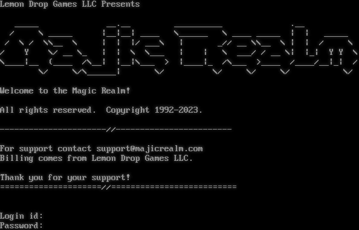 Lemon Drop Games LLC Presents _​____ _​_.__ _​_________ .__ / \\ _​____ \|__\|__\| _​___ \\_​_____ \\ _​___ _​____ \| \| _​____ / \\ / \\\\__ \\ \| \| \|/ ___\\ \| _// __ \\\\__ \\ \| \| / \\ / Y \\/ __ \\_ \| \| \\ \\___ \| \| \\ ___/ / __ \\\| \|_\| Y Y \\ \\_​___\|__ (_​___ /\\__\| \|__\|\\___ > \|_​___\|_ /\\___ >_​___ /_​___/__\|_\| / \\/ \\/\\_​_____\| \\/ \\/ \\/ \\/ \\/ Welcome to the Magic Realm! All rights reserved. Copyright 1992-2023. -​---------------------//-​----------------------- For support contact support@majicrealm.com Billing comes from Lemon Drop Games LLC. Thank you for your support! =​====================//=​========================= Login id: Password:
