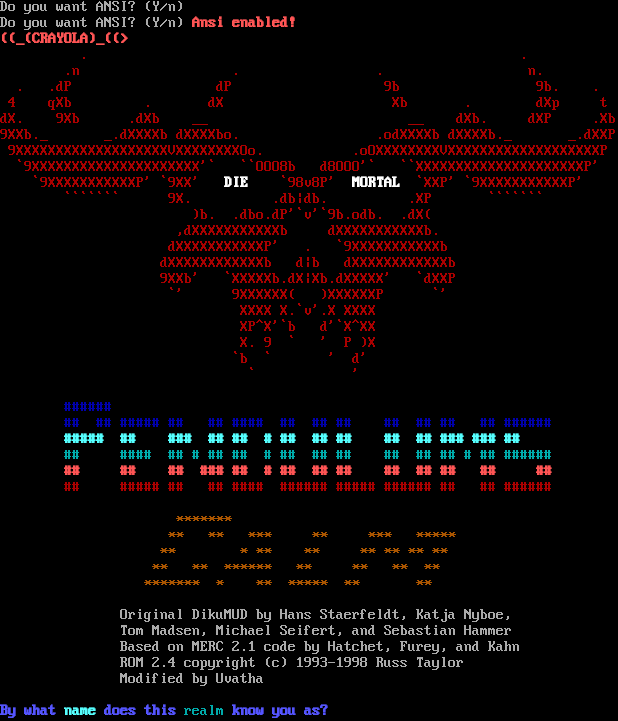 Do you want ANSI? (Y/n) Do you want ANSI? (Y/n) Ansi enabled! ((_(CRAYOLA)_((> . . .n . . n. . .dP dP 9b 9b. . 4 qXb . dX Xb . dXp t dX. 9Xb .dXb __ __ dXb. dXP .Xb 9XXb._ _.dXXXXb dXXXXbo. .odXXXXb dXXXXb._ _.dXXP 9XXXXXXXXXXXXXXXXXXXVXXXXXXXXOo. .oOXXXXXXXXVXXXXXXXXXXXXXXXXXXXP \`9XXXXXXXXXXXXXXXXXXXXX'\` \`\`OOO8b d8OOO'\` \`\`XXXXXXXXXXXXXXXXXXXXXP' \`9XXXXXXXXXXXP' \`9XX' DIE \`98v8P' MORTAL \`XXP' \`9XXXXXXXXXXXP' \`\`\`\`\`\`\` 9X. .db\|db. .XP \`\`\`\`\`\`\` )b. .dbo.dP'\`v'\`9b.odb. .dX( ,dXXXXXXXXXXXb dXXXXXXXXXXXb. dXXXXXXXXXXXP' . \`9XXXXXXXXXXXb dXXXXXXXXXXXXb d\|b dXXXXXXXXXXXXb 9XXb' \`XXXXXb.dX\|Xb.dXXXXX' \`dXXP \`' 9XXXXXX( )XXXXXXP \`' XXXX X.\`v'.X XXXX XP^X'\`b d'\`X^XX X. 9 \` ' P )X \`b \` ' d' \` ' #​##### ## ## #​#### ## ## #​### ## ## ## ## ## ## ## #​##### #​#### ## ### ## ## # ## ## ## ## ## ### ### ## ## #​### ## # ## ## # ## ## ## ## ## ## # ## #​##### ## ## ## ### ## # ## ## ## ## ## ## ## ## ## #​#### ## ## #​### #​##### #​#### #​##### ## ## #​##### \*\*\*\*\*\*\* \*\* \*\* \*\*\* \*\* \*\*\* \*\*\*\*\* \*\* \* \*\* \*\* \*\* \*\* \*\* \*\* \*\* \*\* \*\*\*\*\*\* \*\* \*\* \*\* \*\* \*\*\*\*\*\*\* \* \*\* \*\*\*\*\* \*\* \*\* Original DikuMUD by Hans Staerfeldt, Katja Nyboe, Tom Madsen, Michael Seifert, and Sebastian Hammer Based on MERC 2.1 code by Hatchet, Furey, and Kahn ROM 2.4 copyright (c) 1993-1998 Russ Taylor Modified by Uvatha By what name does this realm know you as?