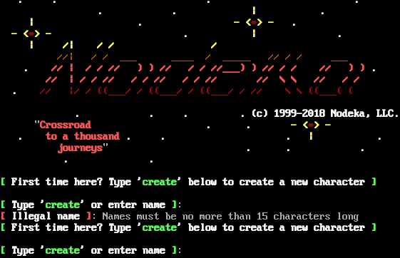 . . . . . . \| . \| . - <\*> - . - <\*> - . \| . \| /\| / / / //\| / / ___ _​___ / _​____ // / / ___ . // \| / / // ) ) // / / //___) ) // / / // ) ) . // \| / / // / / // / / // // \\ \\ // / / . // \|/ / ((___/ / ((___/ / ((___/ / // \\ \\ ((___( ( . . . . (c) 1999-2018 Nodeka, LLC. "Crossroad . . - <\*> - . to a thousand . . . \| . journeys" . . . . . [ First time here? Type 'create' below to create a new character ] [ Type 'create' or enter name ]: [ Illegal name ]: Names must be no more than 15 characters long [ First time here? Type 'create' below to create a new character ] [ Type 'create' or enter name ]: